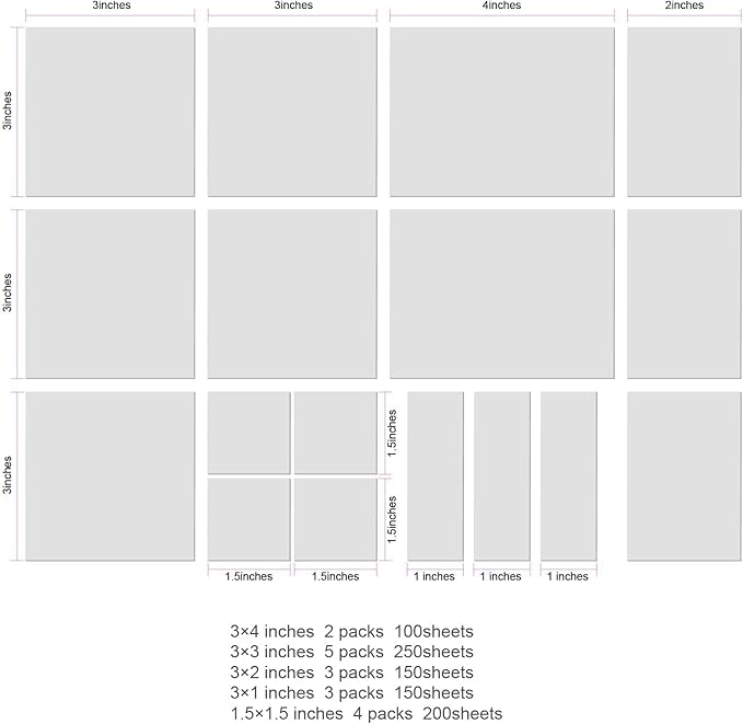 • ►【Size】: (1.5"x1.5" 4 pcs, 3"x1" 3 pcs, 3"x2" 3 pcs, 3"x3" 5 pcs, 3"x4" 2 pcs) 17 pcs 850 sheets