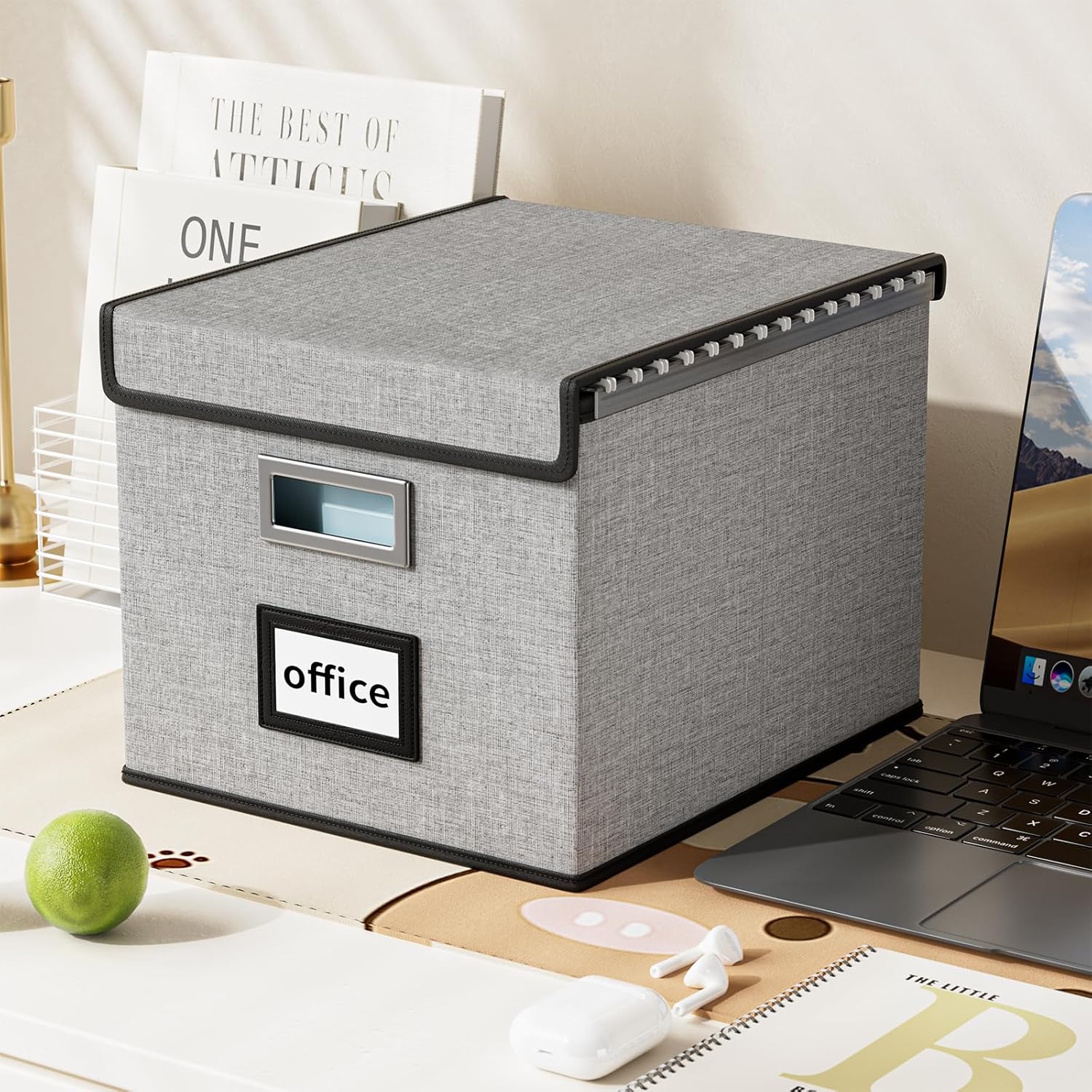 Huolewa Collapsible File Storage Organizer Boxes with Lids, Portable Large Linen Hanging Filing Storage Boxes, Decorative Home/Office Filling System for File and Folder Storage (Grey)-2 Pack