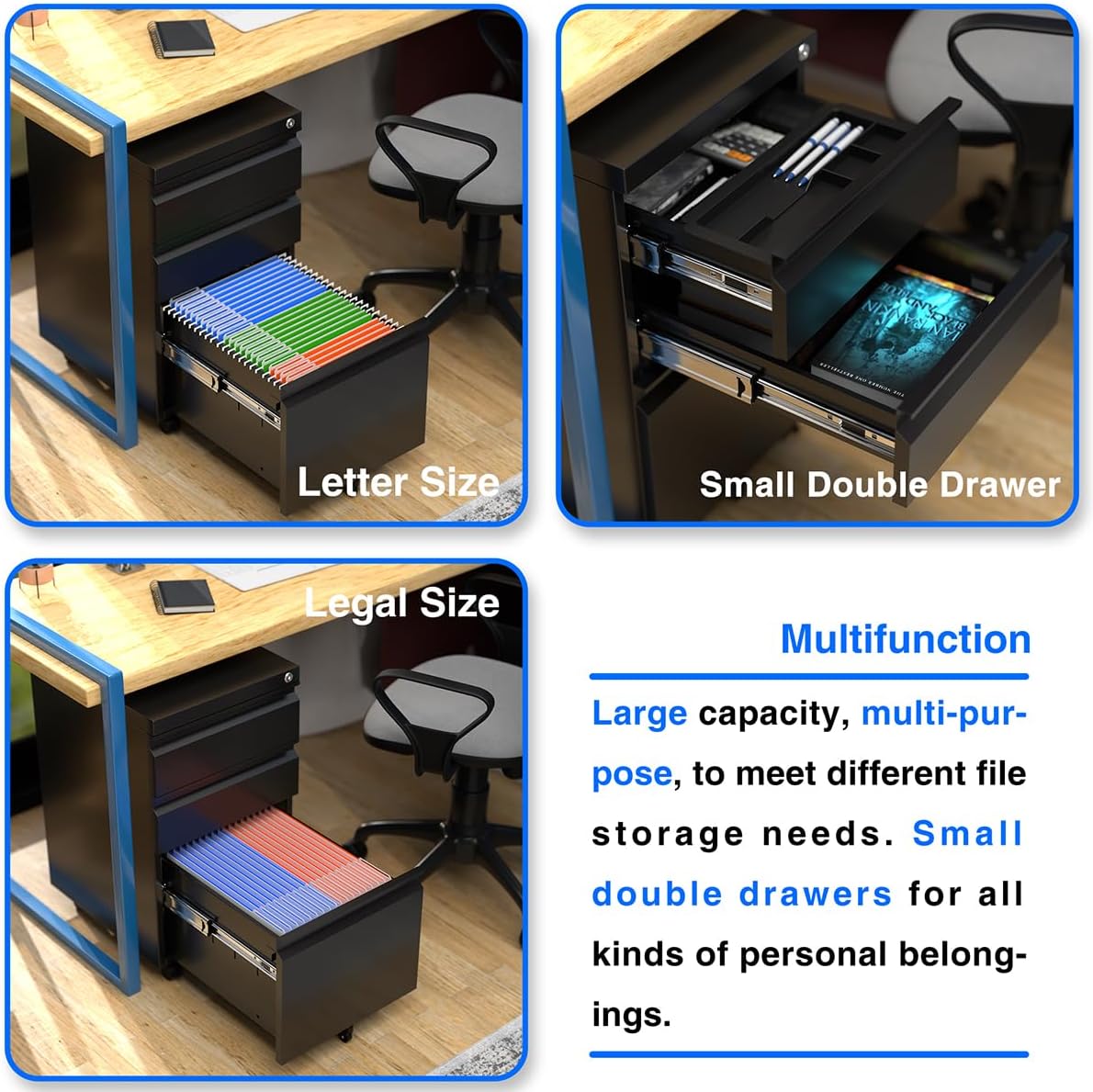 • Effortless Mobility with Advanced Wheels: Equipped with five 360-degree rotating wheels (including 2 lockable front wheels and a center wheel designed to prevent anti-tipping), this under desk file cabinet moves smoothly without producing noise, offering stability and ease of use in any workspace;