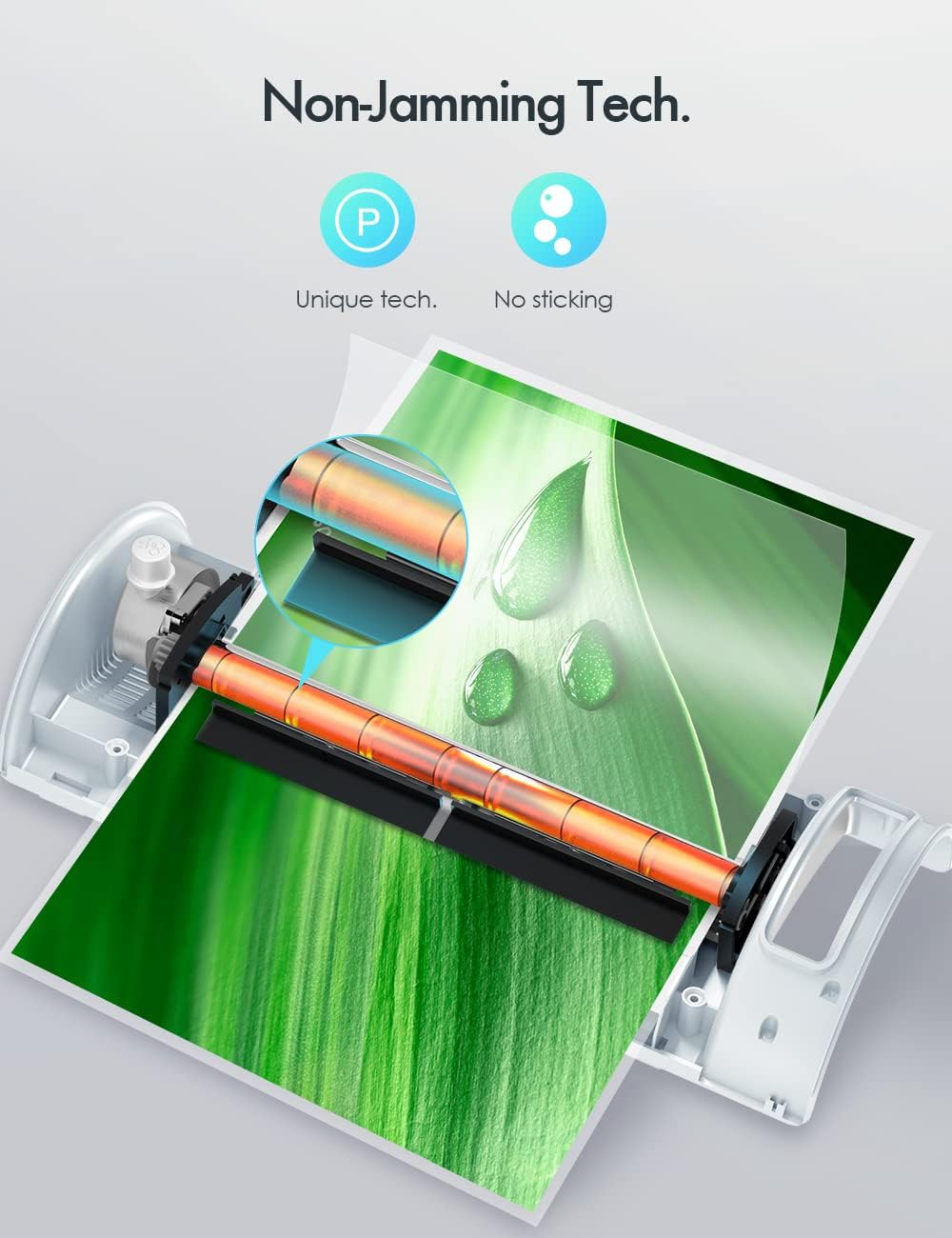 • 【1min Warm-Up】Use exclusive patented technology, with a quick 1min warm-up and fast laminating speed of 400mm/min to boost your efficiency, protect your important document. The intelligent temperature control system can keep the machine at a suitable and accurate temperature.