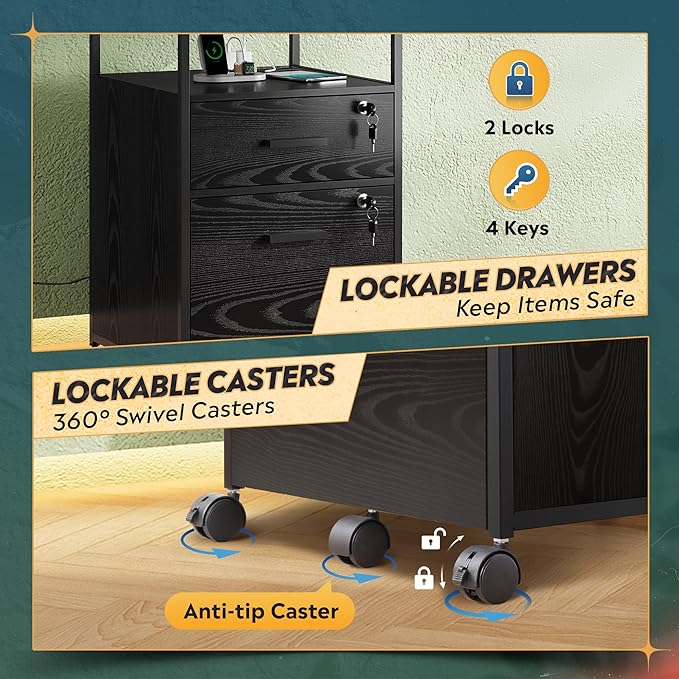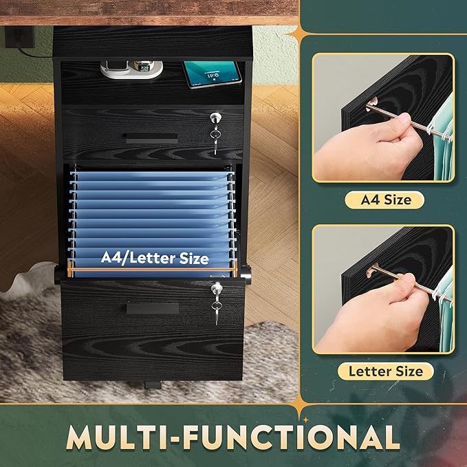 • Chargeable File Cabinet: This filing cabinet is equipped with AC power outlet and USB port, you can fix it next to or under desk, which ensure that you can charge cell phone, printer and other devices while you are working, and also enhance the convenience in home office.