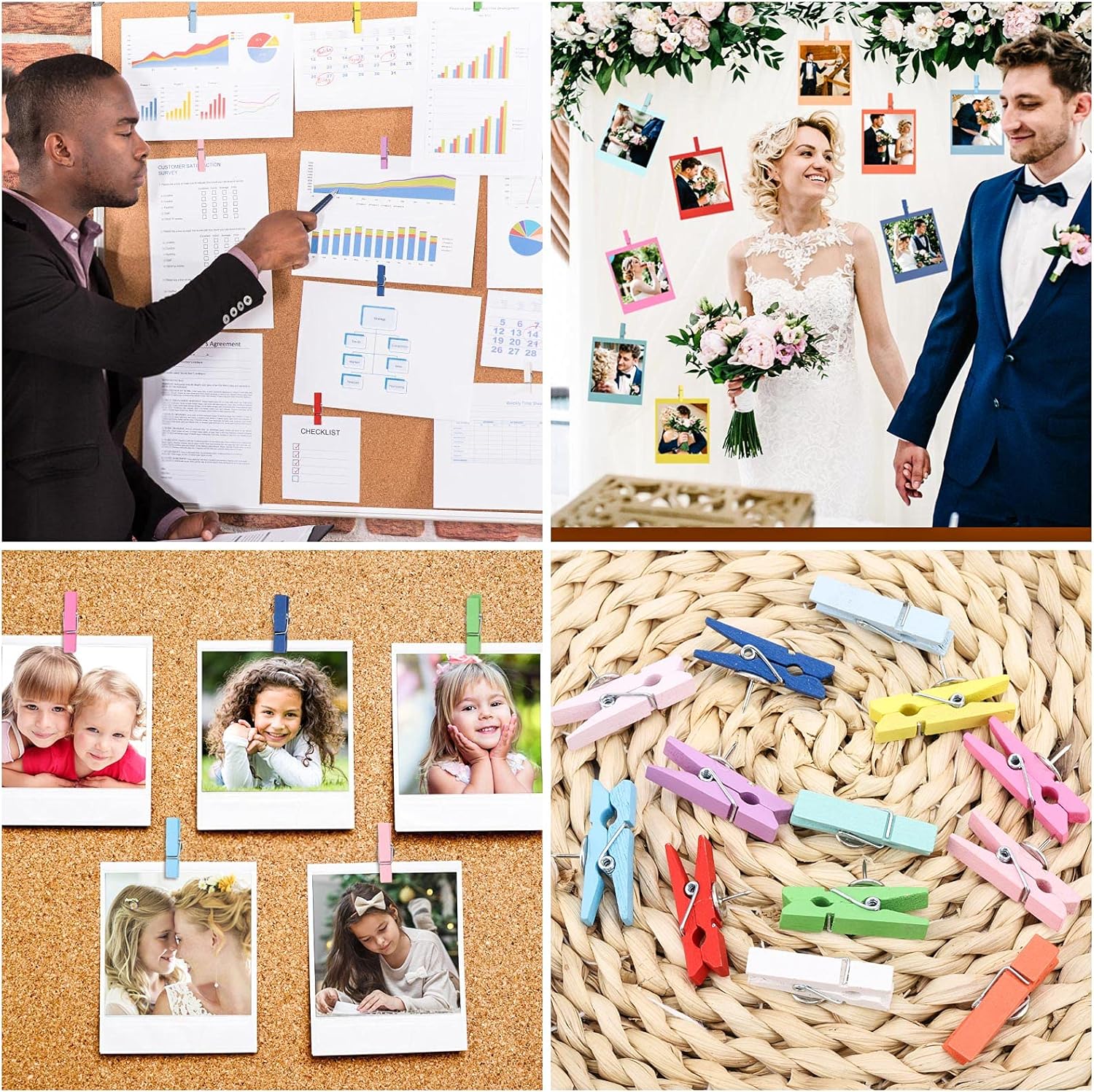 • Wooden clips combine the advantages of clips and pins to enable damage-free display of photos, pictures and notes on a corkboard or bulletin board. And you don't have to remove and insert them from the corkboard as often