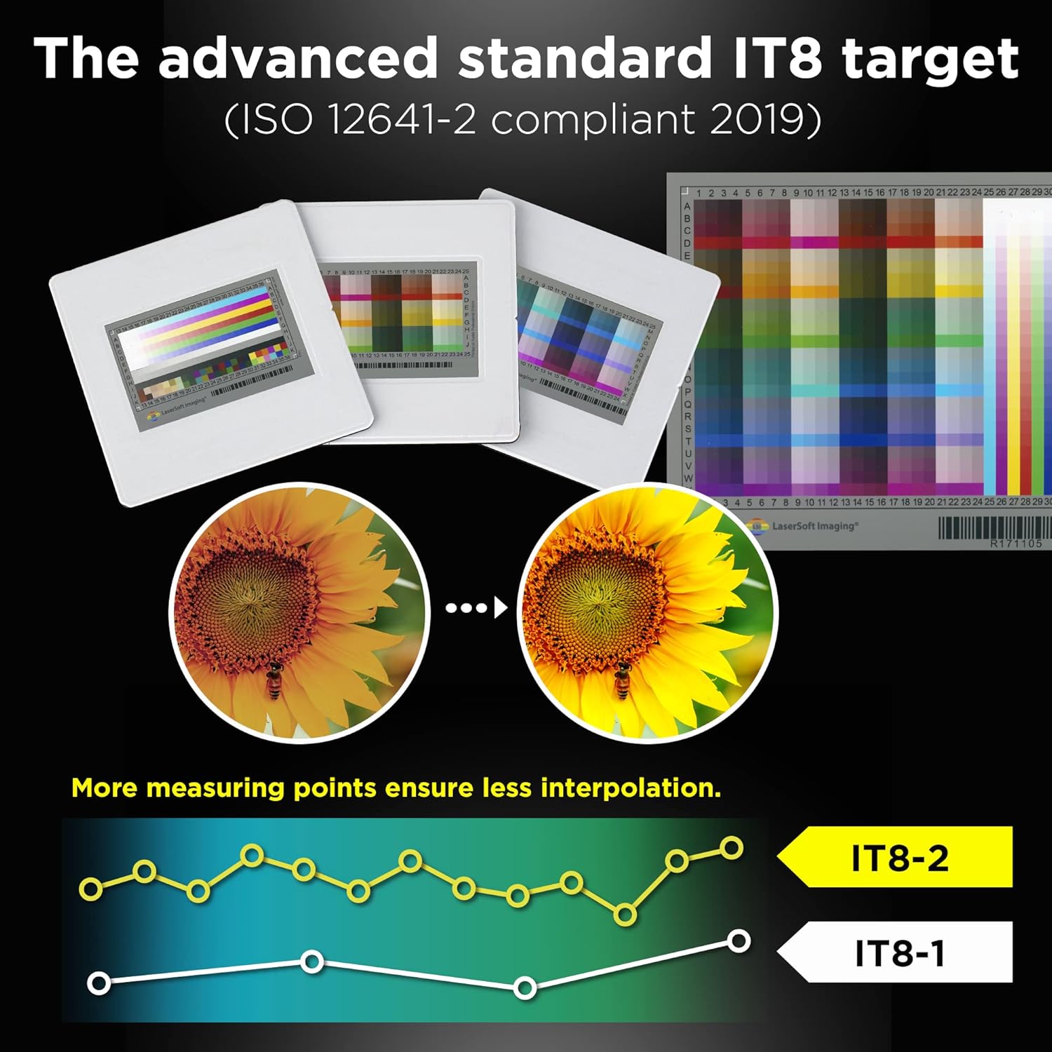 • [Advanced IT 8 Targets Included] bundled with 3-slide of 35mm Calibration Target (99 USD), this advanced standard IT8 target (ISO 12641-2 compliant 2019) gives more measuring point to ensure less interpolation while performing scanner color calibration.