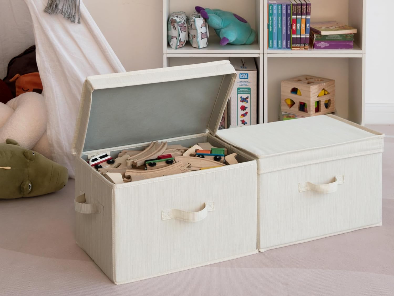• Dust-proof storage bins feature flip-top lids and 3 sewn-in handles on the front, back and left side, making it easy for you to carry the storage bins.