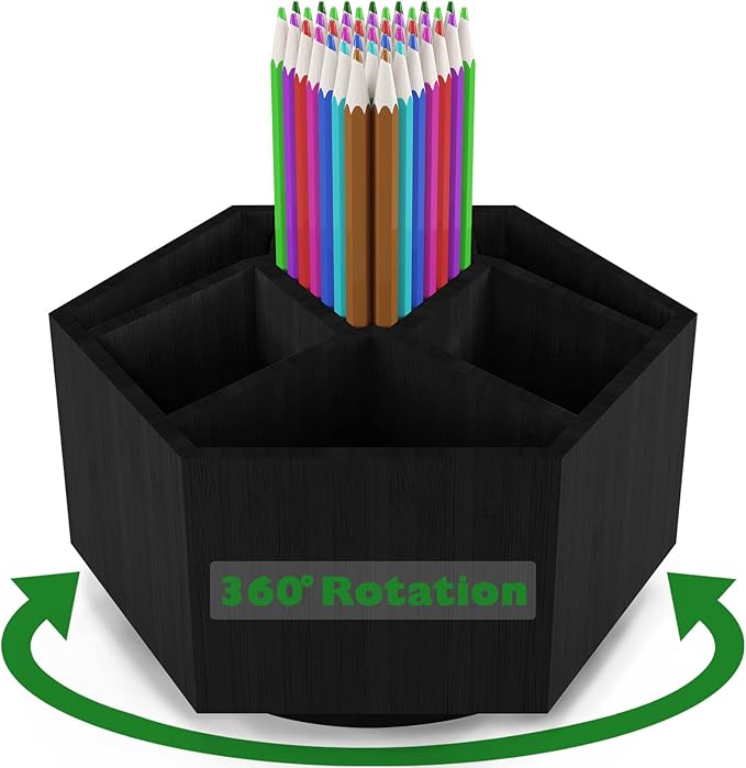 • 【MULTIFUNCTIONAL PURPOSE】The spinning organizer is designed to keep your stuff well organized, 7 sections, 1 big triangle section in middle will be perfect for your pens, crayons, scissors, paint brushes, scissors, staplers stationery, cutlery and more. The elegant design of our desktop storage organizer makes it perfect to use for classroom, living room, office supplies