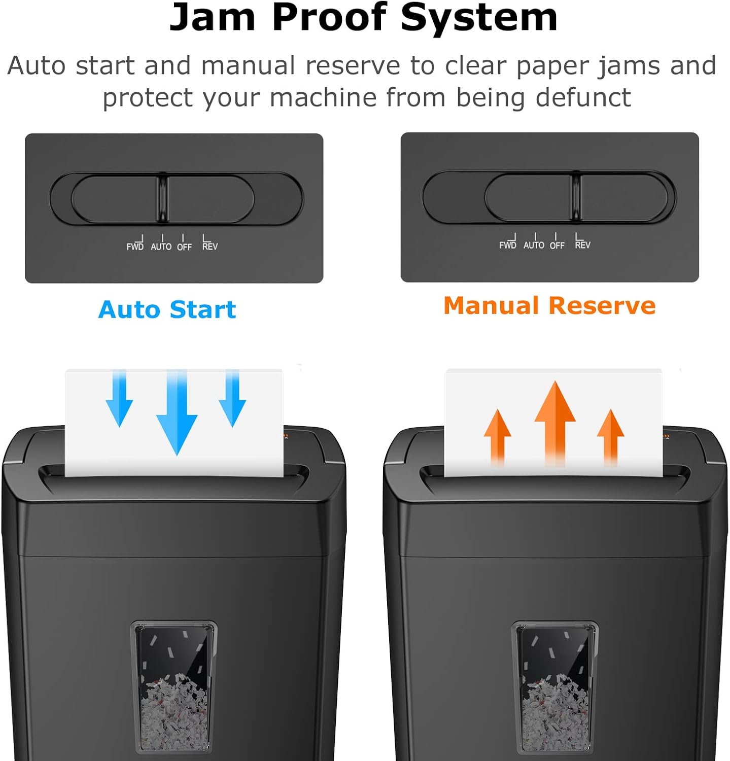 • 【Easy Operation & Safe Protection】Auto start/stop and manual-forward/reverse function protect the paper shredder heavy duty from the frustration of paper jams. Overheat protection helps you use paper shredder without worrying and prolong its lifetime. The document shredder will stop working once lift the head, keeping you safe.Important Note: We test every shredder before shipping, which means you may see some paper shreds from the testing.
