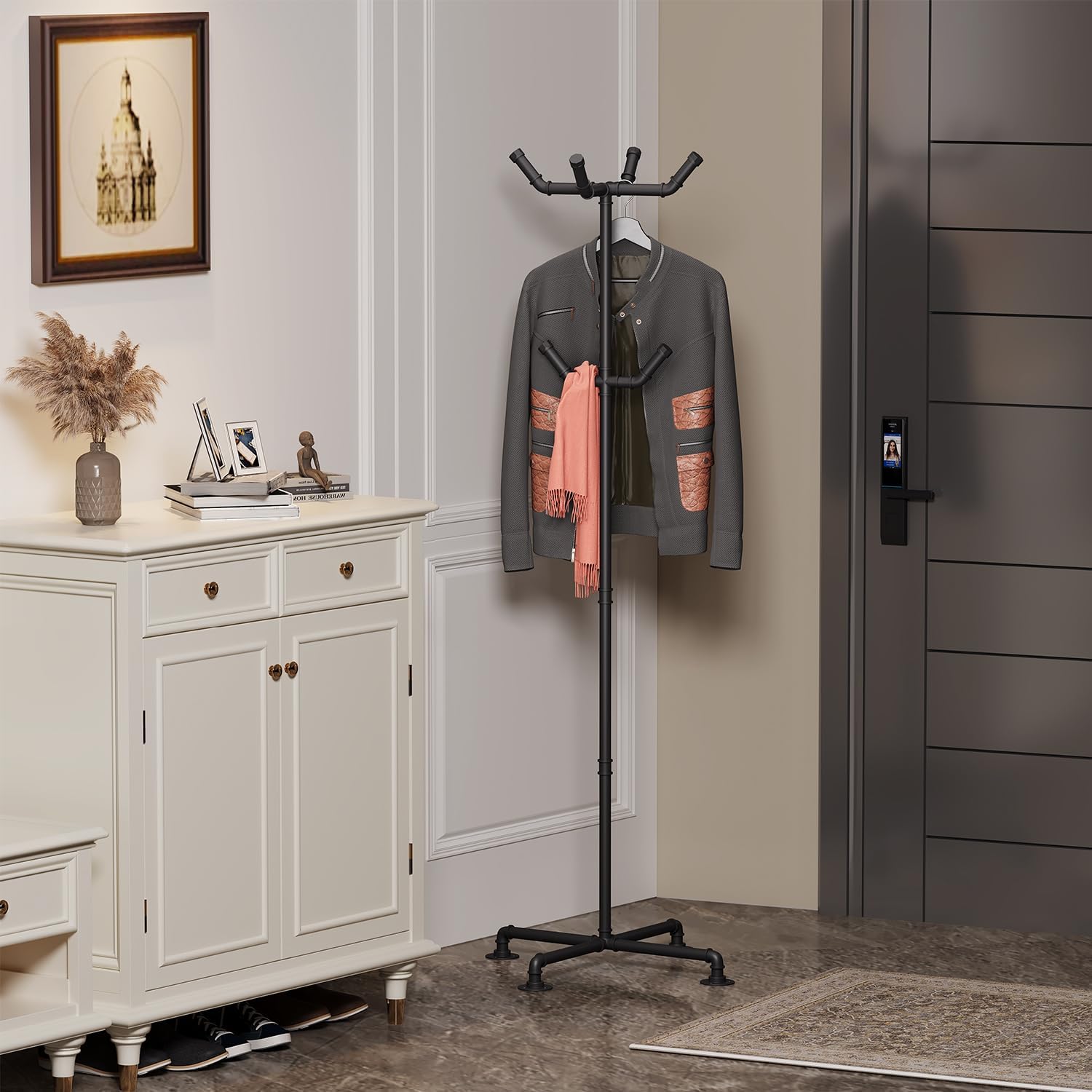 Industrial Coat Rack,Metal Pipe Coat Rack Stand Freestanding with 6 Hooks,Heavy Duty Coat Tree Sturdy Coat Racks for Entryway, Hallway, Bedroom (Black)