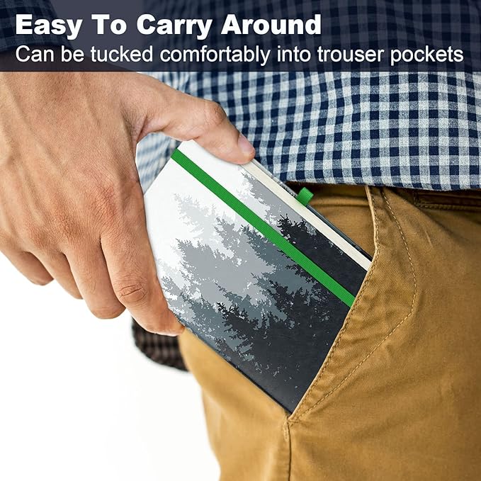 • Pocket Hardcover Notebook: The cute A6 mini notebooks measures 3.9x5.7inch. Fits in back pocket, shirt pocket or purse well. Includes 160 pages ivory thick paper, 1 ribbon bookmark, 1 inner pocket, 1 Pen Holder loop and 1 elastic closure band