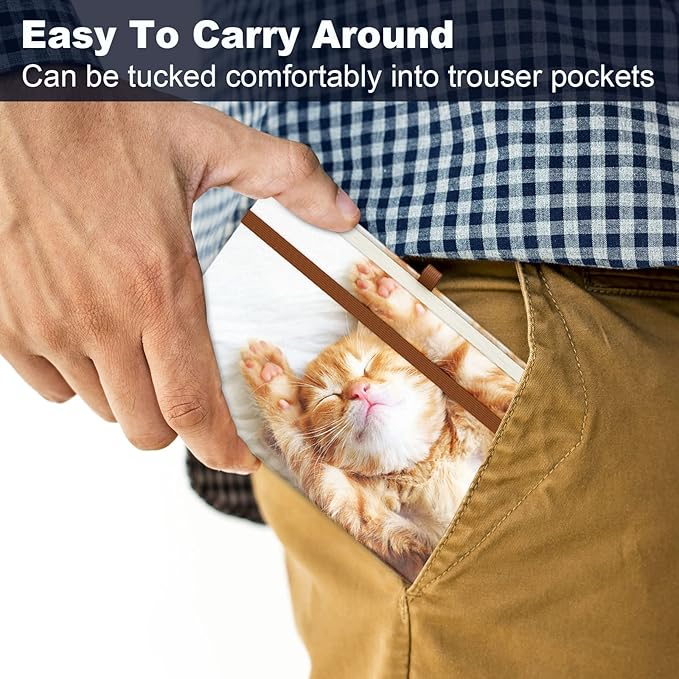 • Pocket Hardcover Notebook: The cute A6 mini notebooks measures 3.9x5.7inch. Fits in back pocket, shirt pocket or purse well. Includes 160 pages ivory thick paper, 1 ribbon bookmark, 1 inner pocket, 1 Pen Holder loop and 1 elastic closure band