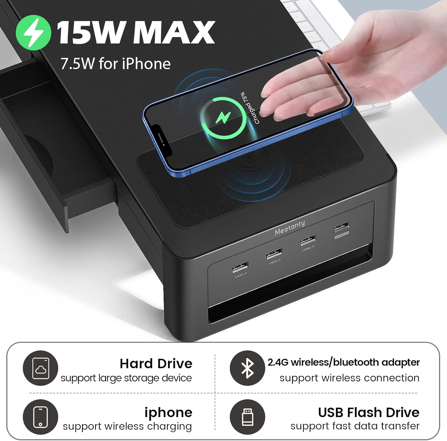 • 【Wireless Charging Module】With Max 15W wireless charger, Meatanty monitor stand makes charging more convenient by simply putting your phone on the charging area.Tips: If your iPhone is properly placed on the wireless charging pad but still can't be charged, please reboot your phone.