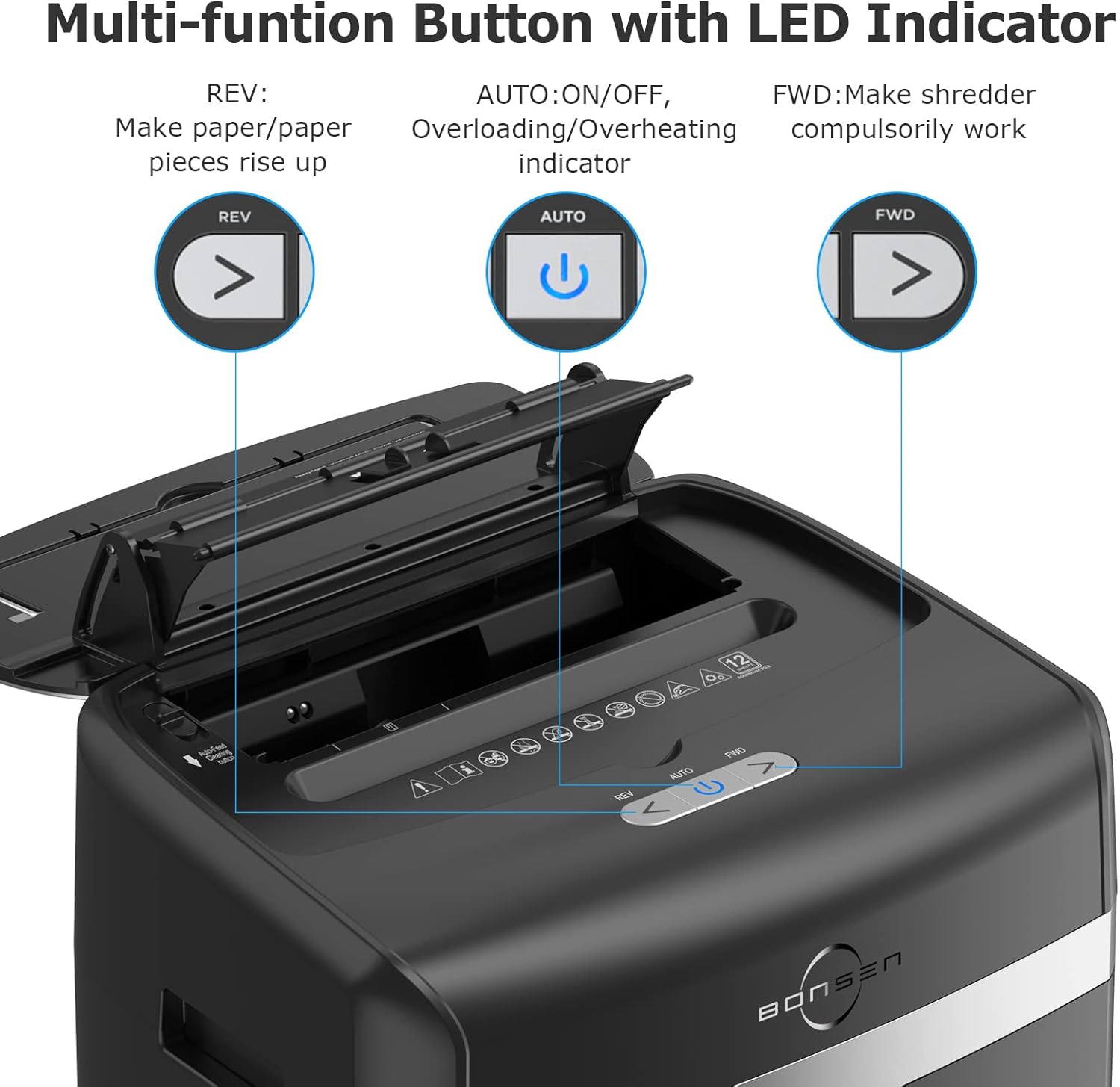 • Two Different Shredding Mode: BONSEN paper shredder designed with Auto & Manual modes; 120 sheets automatic shredding (only for paper) and 12 sheets manual shredding capacity (shreds paper, clips, staples and credit card)