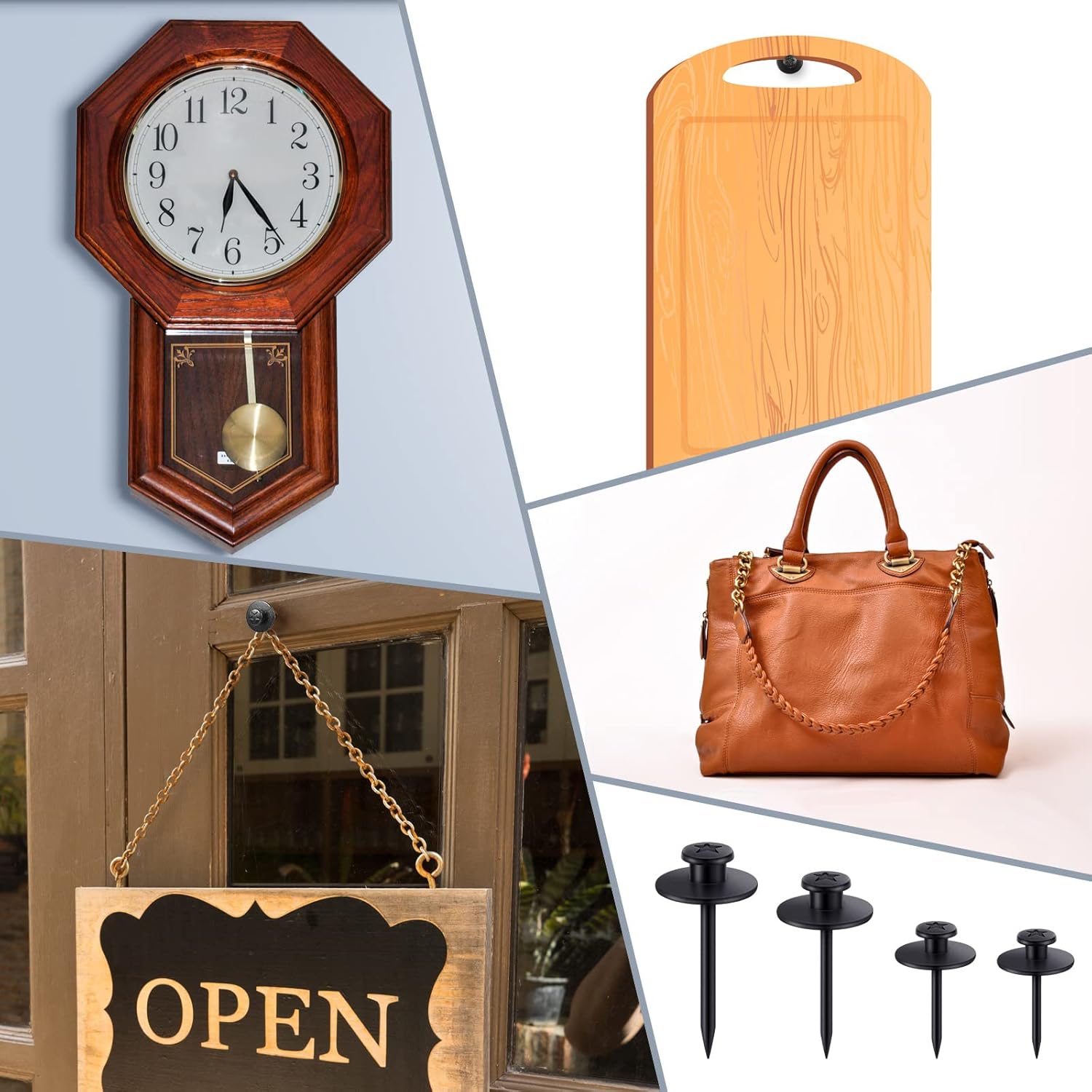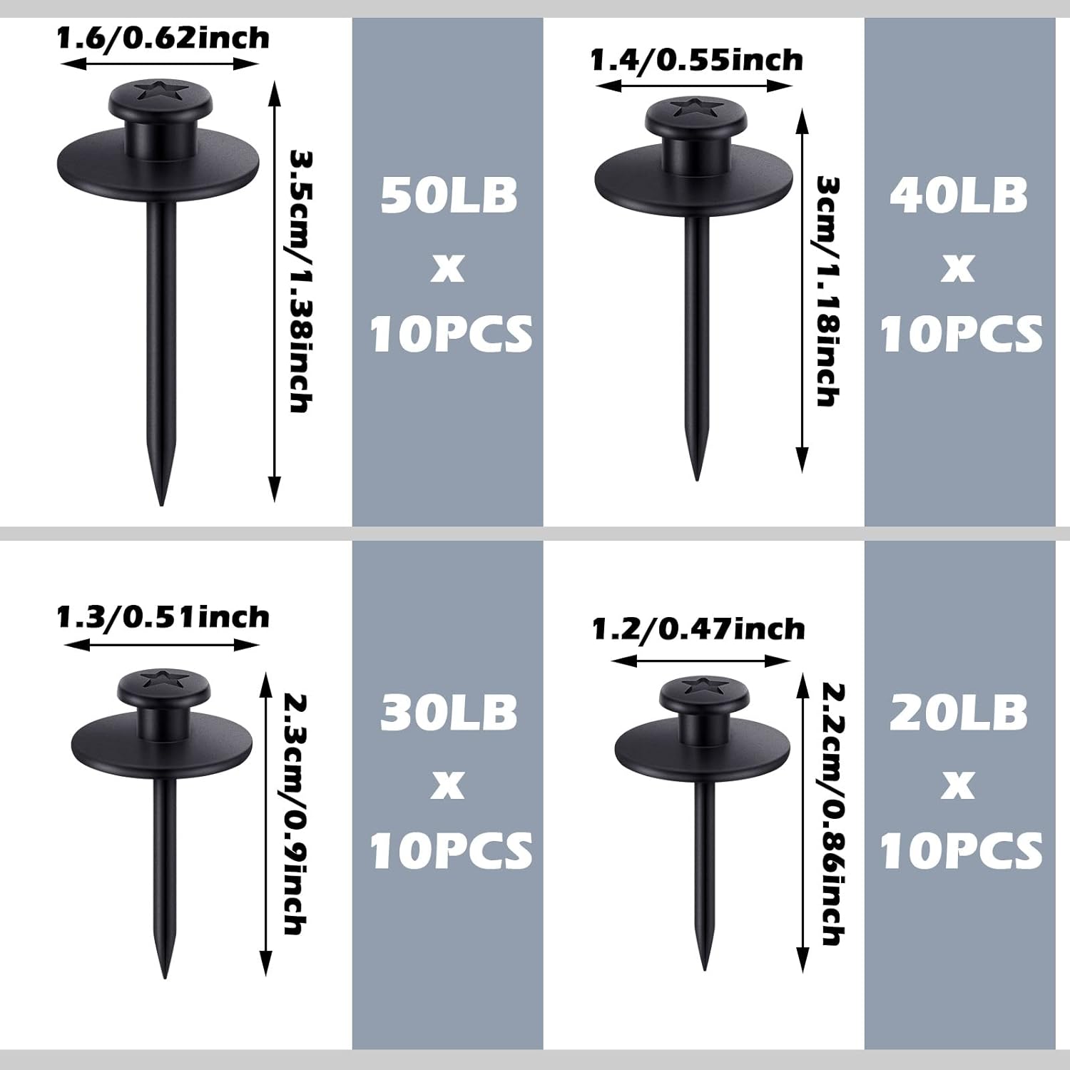 Zhengmy 40 Pcs Double Headed Picture Hangers Nails 4 Size Long Thumb Tacks Wall Nails for Hanging Pictures Decorative Push Pins Hooks for Drywall Photo Office Home Decor, 20/30/ 40/ 50lb(Black)