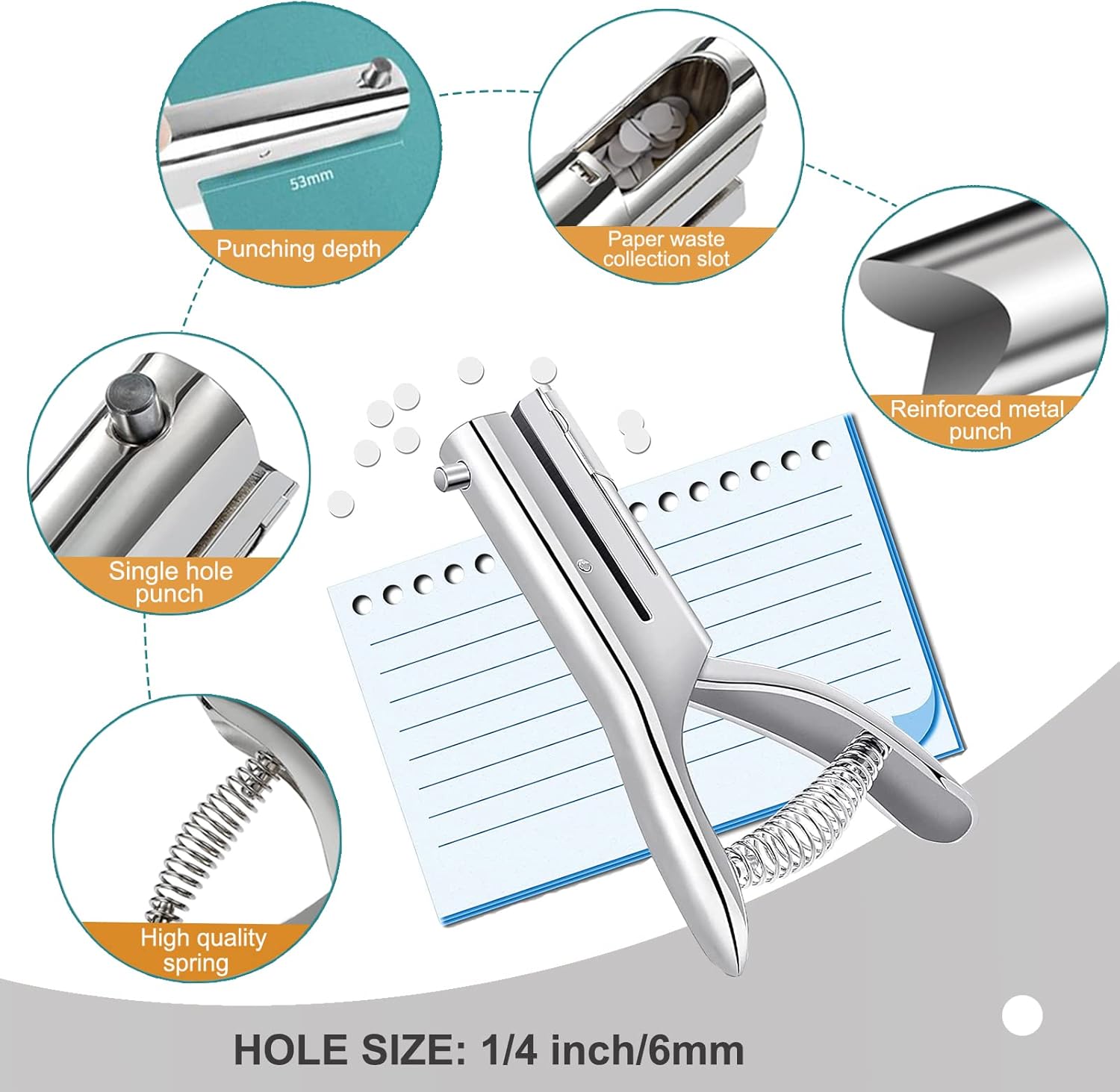 • Punching Depth: This heavy duty hole punch ultra-long-distance paper input depth is up to 53MM, it can be punched anywhere on a business card or a 6-inch photo. The traditional hole punch can only punch within 10MM at the edge. This is something other single hole punch can't do. The center of the hole is exactly 53mm from the edge