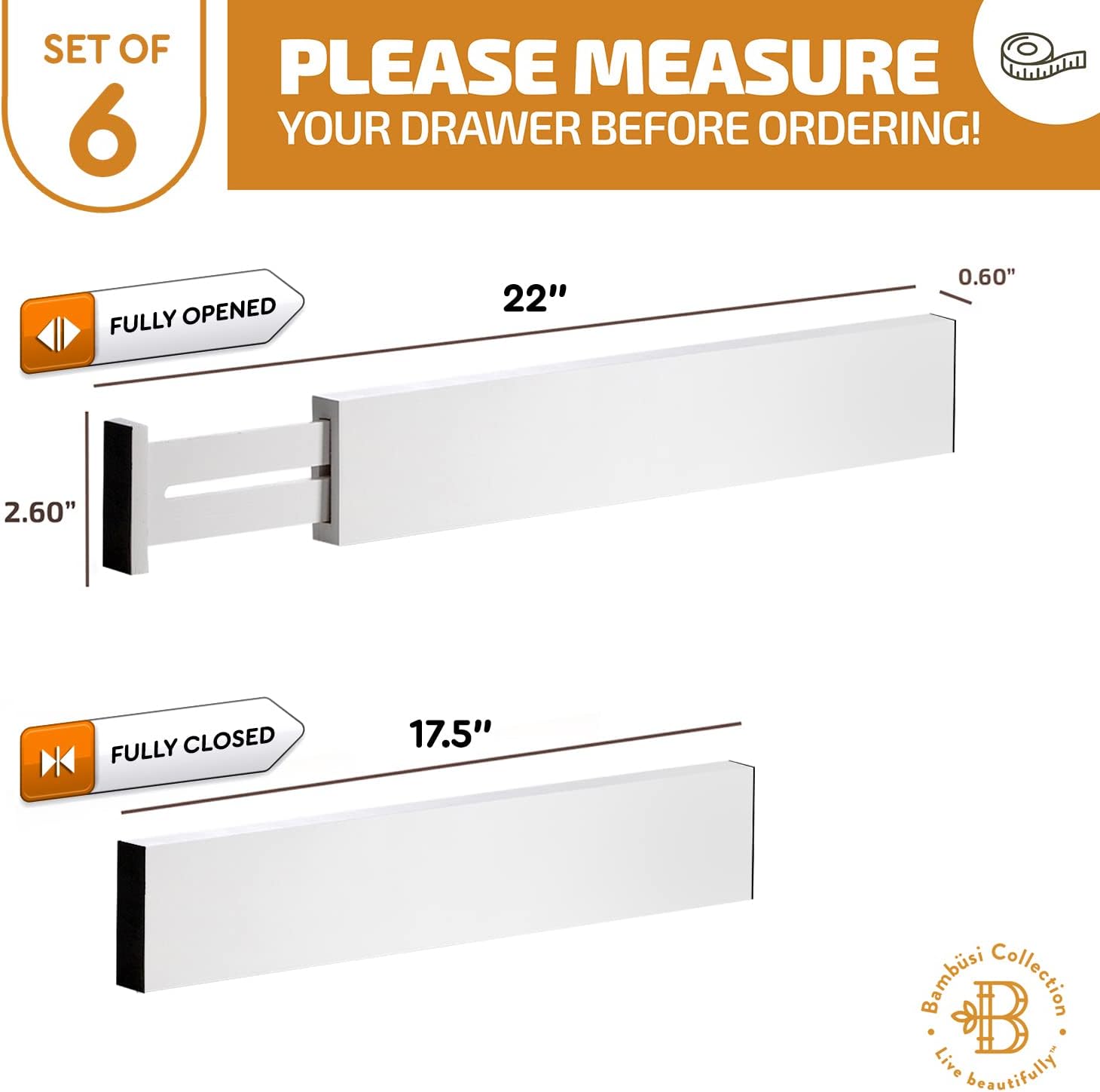 Adjustable Bamboo Drawer Divider Organizers - 6 Pack Large Expandable Drawer Organization Separators for Kitchen Utensils, Dresser, Bedroom, Bathroom, Baby Drawer, Office - 17.5” to 22" (White)