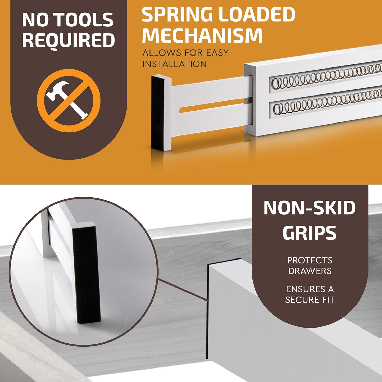 • QUICK & EASY INSTALLATION - The wood kitchen drawer dividers are spring-loaded with excellent tension + padded at the ends with eva foam, keeping the bamboo drawer dividers tightly in place. Installation is a simple swipe, without scratching your furniture.