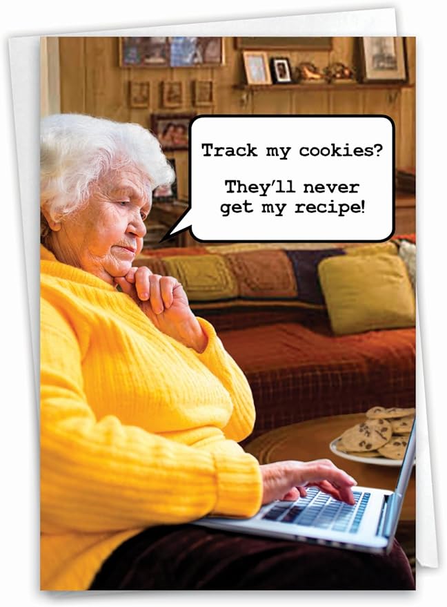 • INSIDE GREETING: "Or find out your real age! Happy Birthday!" COVER - Track my cookies? They'll never get my recipe!