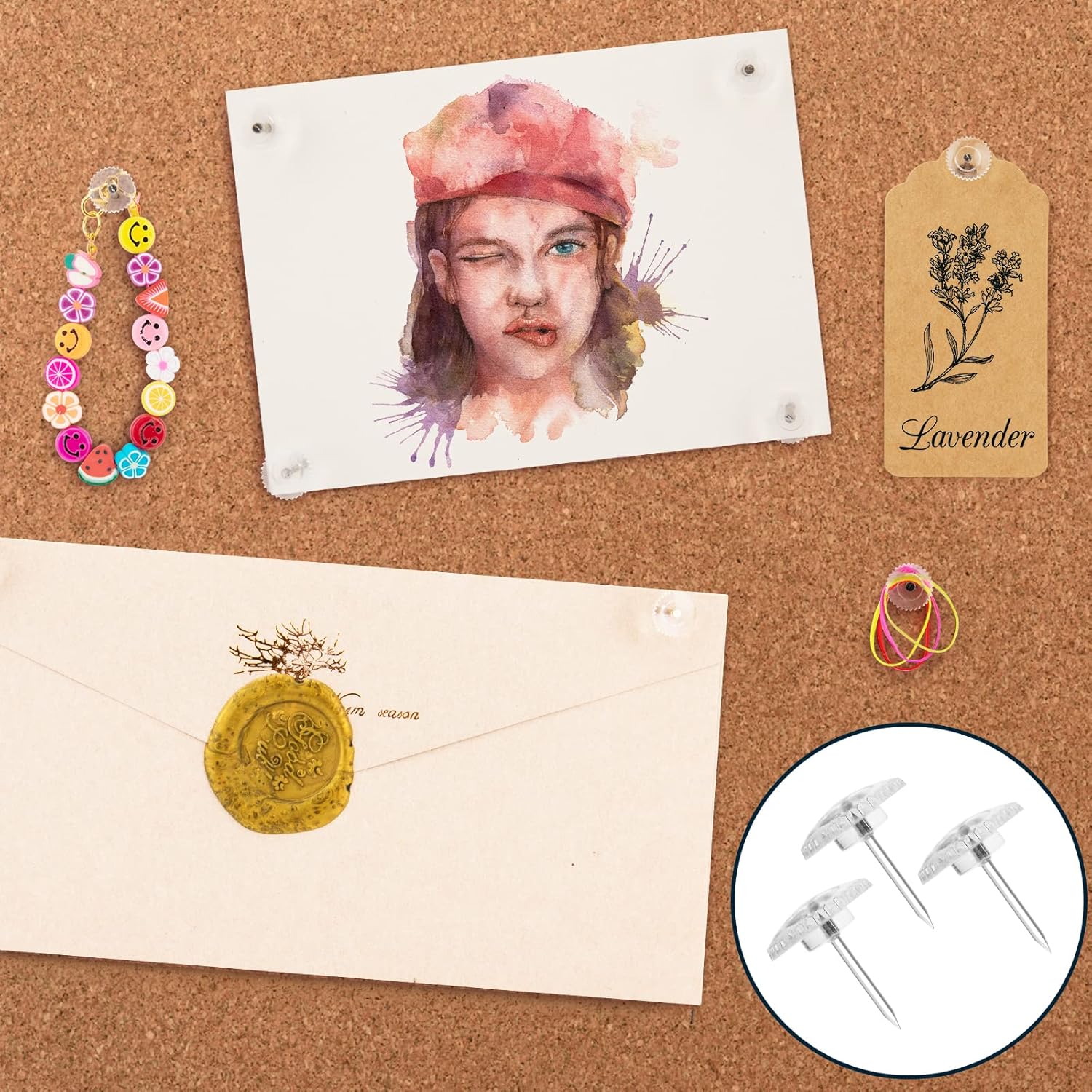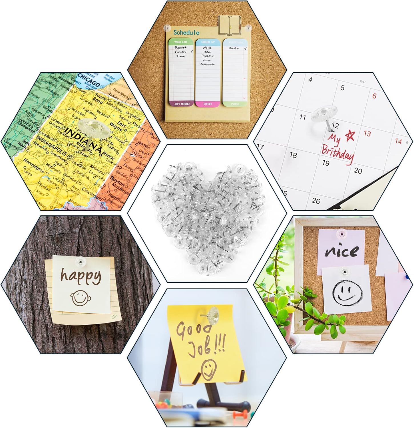 • 1. Premium Flat Push Pins: these clear thumbtacks are composed of plastic head and steel point, sharp and durable, which are not easy to bent or broken short, created to stand years of use.