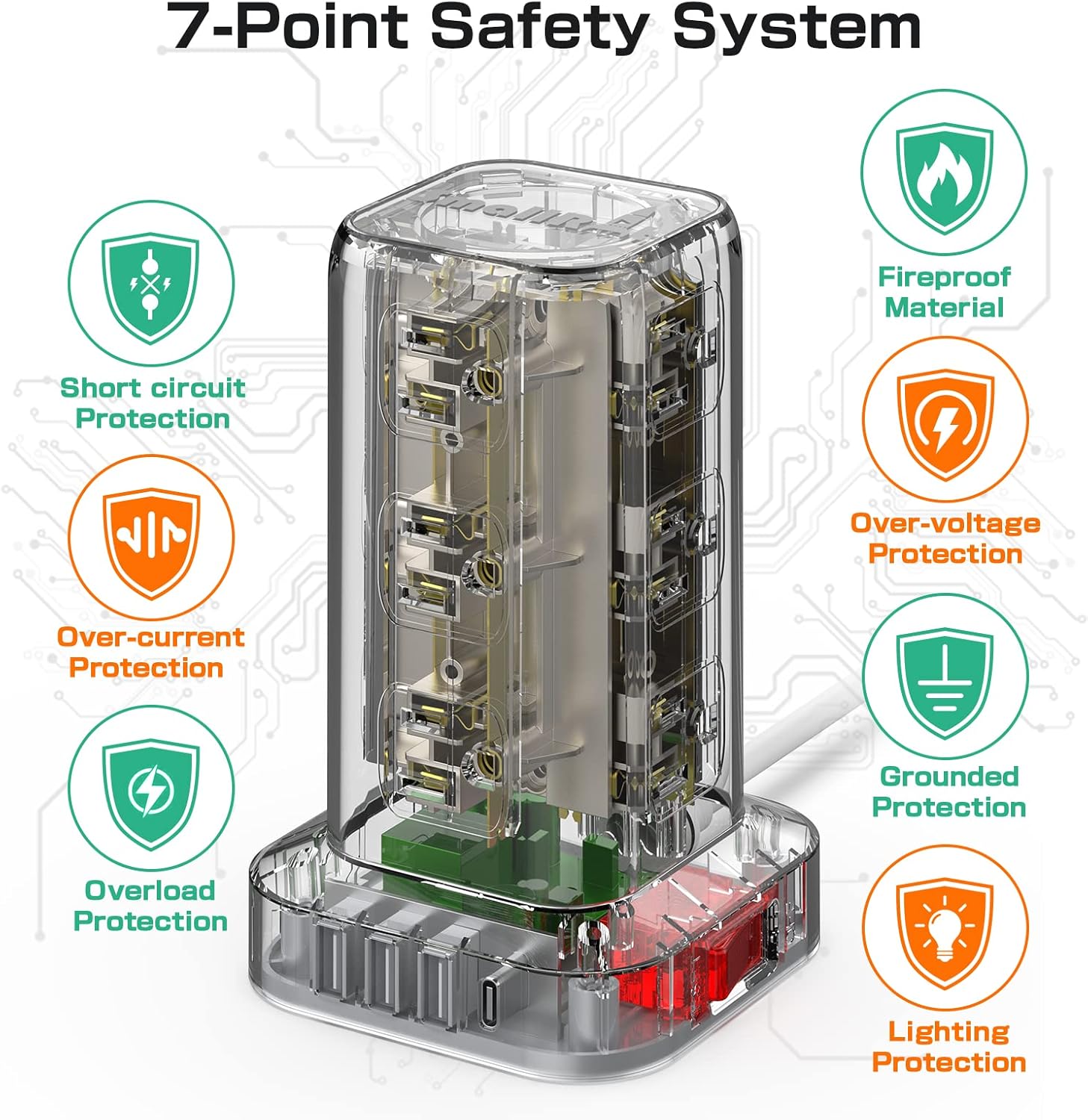 • 【Safe and Ease of use 】The 6.5FT upgraded extension cord with multiple outlets is made of pure copper. Reinforced design at the junction of the stand of power strip tower and the wire head. To protect the terminal from wear and tear. Environmental protection and fire-resistance PC shell with flame retardant at 1382℉ makes it more safe and longer lifetime.