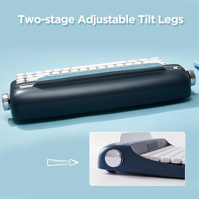 • VINTAGE TYPEWRITER KEYBOARD WITH INTEGRATED STAND: The YUNZII actto B303 wireless typewriter keyboard includes an integrated stand holder for pad, phone and tablet, which matches the aesthetic of your desk and saves space. The wireless mini compact also includes adjustable feet, allowing you to set the angle for maximum comfort during long typing sessions. The built-in tablet or phone holder is 12.9 inches long and 0.59 inches wide.