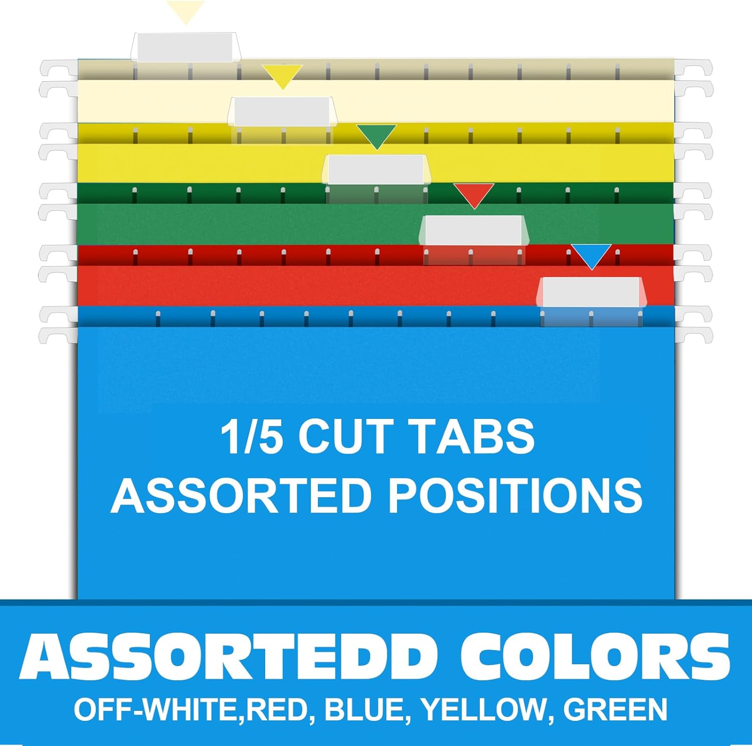 • HANGING FOLDERS SET: Contains 30 extra capacity folders with 30 cardboard supports, 30 printable label sheets, 30 clear plastic tabs and comes in 5 assorted primary colors (off-white, red, blue, yellow, and green) to make color coded filing a snap.