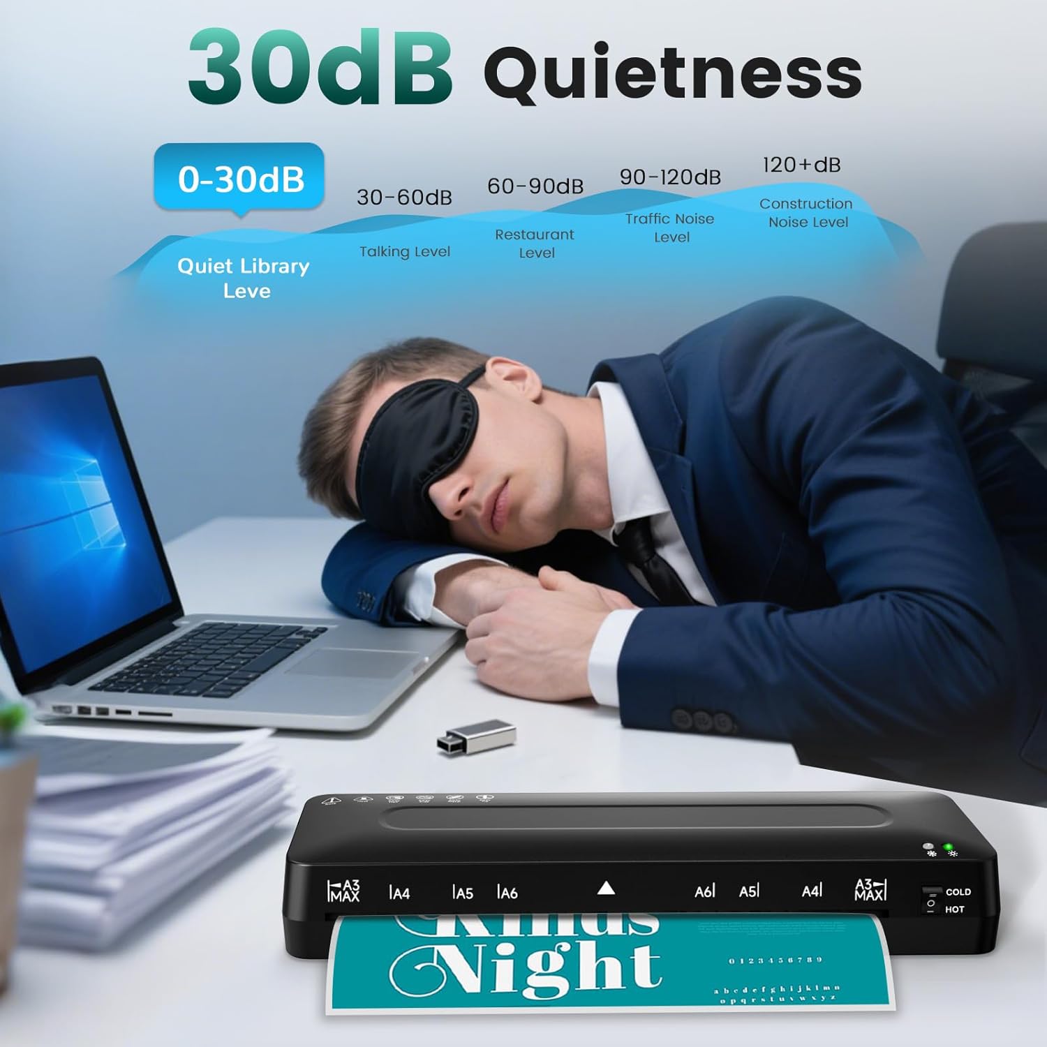 • Quiet Operation and Intelligent Safety: Equipped with an advanced temperature control system, this laminator machine with laminating sheets operates at less than 55db, providing a quiet working environment. Ideal for teachers and anyone in need of a personal laminator, it offers a safe, efficient lamination process, extending the lifespan of the machine while maintaining high-quality results