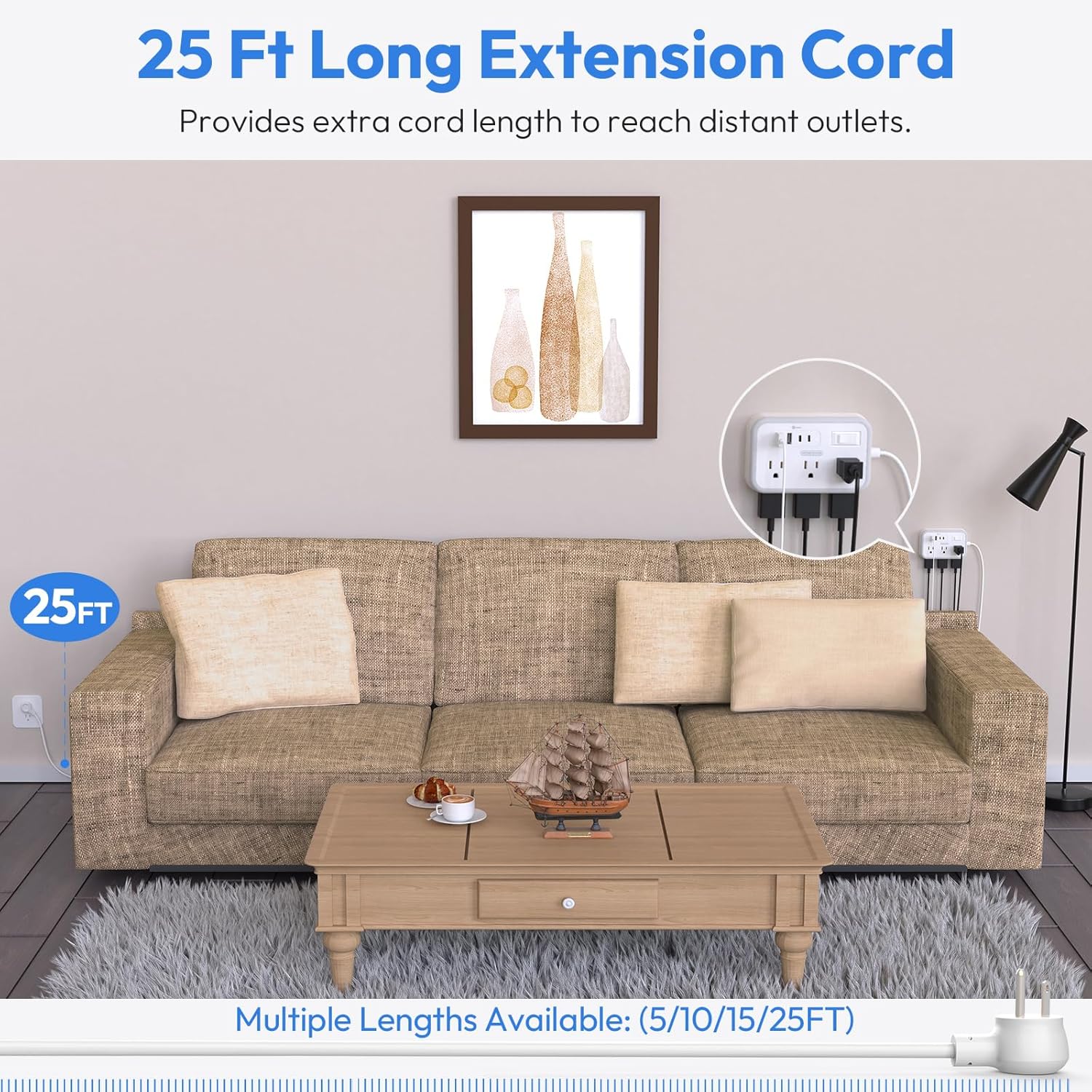 • 【 25 ft Extra Long Extension Cord Flat Plug 】The 25 ft power strip to the white extension cord provides extra outlets at optimal reach in home and office spaces. The right angle flat plug power strip is easier for cable management when plugged into the wall or behind furniture, which saves the space.