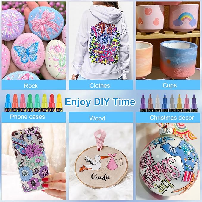 • 【Dual Tip Acrylic Paint Pens】Each acrylic marker come with a 1-5mm round nib and a 1mm fine nib. Dual tip design meets different coloring needs. The fine tip is suitable for outlining, fine line work; The brush tip works well for large areas of coloring, detailing.