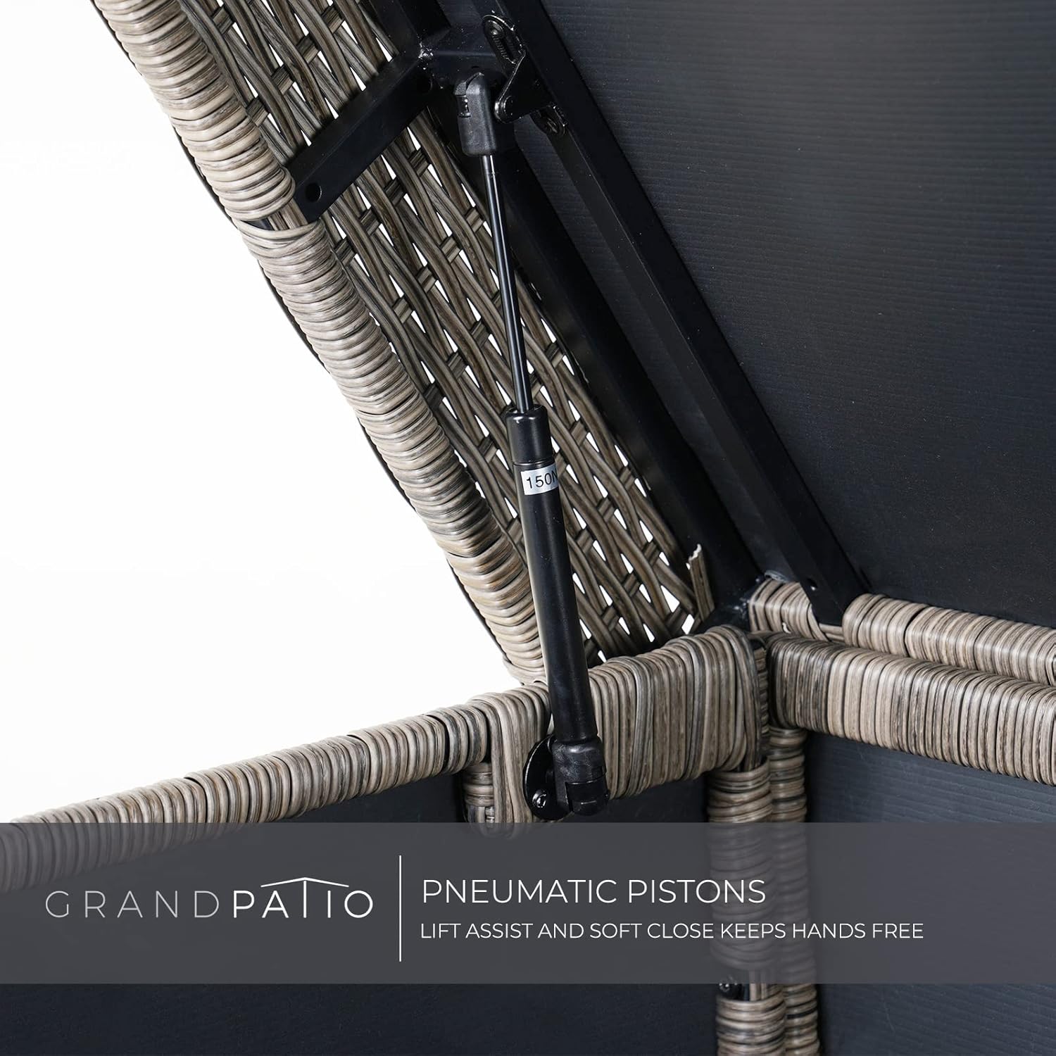 • UNIQUE DESIGN: Children friendly two pneumatic pistons for easy lift and soft closure, a feature you will appreciate when you have your hands full. Combined with water risistant widened lid to protect your belongings better, meanwhile you can open outdoor wicker storage easily by front pull. Holes at bottom of patio storage box for good ventilation to keep inside clean.