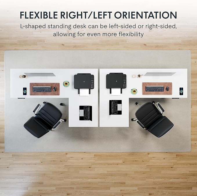 • L Shape with 2 Part Top - Includes a spacious main desk and return desk, accommodating a variety of monitor and laptop setups along with important work materials, supplies, and decor. When fully assembled, the outside surface measures 71" x 48"