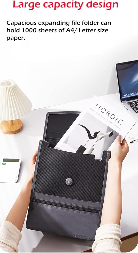 • 【3-1/2" Expansion 】Product size: 12.6”×10.2”×3.1” (L* W* H). Capacious expanding file folder can hold 1000 sheets of A4/ Letter size paper. It is large enough to keep all of your important documents securely without getting all bunched up but also compact enough to carry in a backpack.