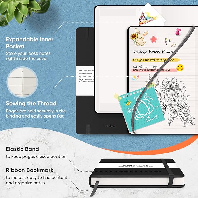 • Expandable Pocket + Elastic Closure Band+ 1 Ribbon Bookmark - The elastic band is strong and the page marker comes in handy. It has a handy-dandy pocket in the back to keep business cards, notes, receipts and other small paper items. Huhuhero notebook will provide perfect writing experience, great for bullet jounaling, studying, journaling, note taking, daily planning, drawing. Premium college supplies, office supplies, art supplies.