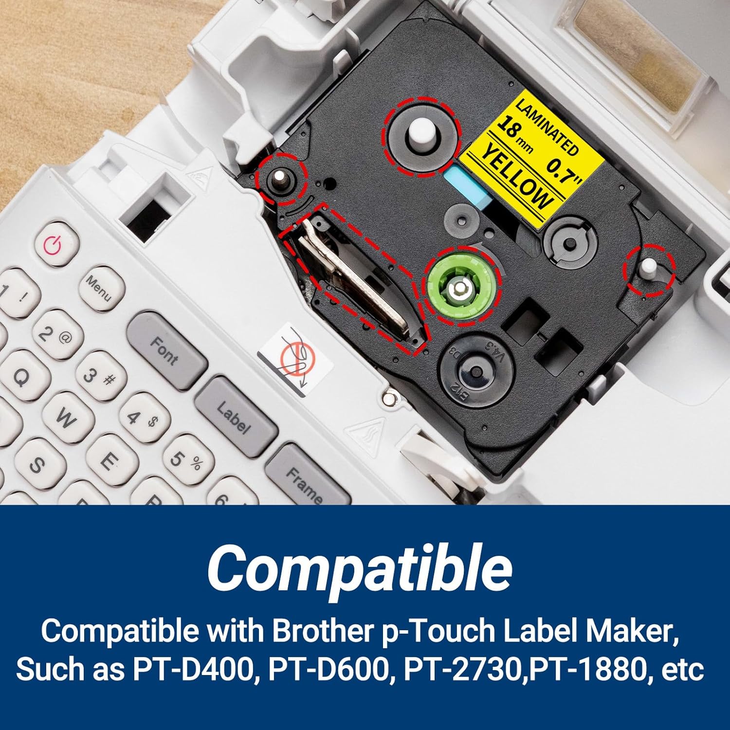 • Compatible with Brother P Touch label makers that use up to 18mm 0.7 inch TZe label tapes yellow: PT-D400, PT-D600, PT-D400AD, PT-D400VP, PT-D600VP, PT-P710BT, PT-P750W, PT-E550W, PT-P700, PT-2730VP, PT-H500LI, PT-2730, PT-2430PC, PT-D450, PT-1880, PT-1830, PT-1890SC, PT-2300, PT-300, PT-310, PT-E300, PT-E300VP, PT-E500, PT-E550W, PT-520, PT-530, PT-540, PT-550, PT-1400, PT-1500, PT-1500PC, PT-1600, PT-2110, PT-2200, PT-2210, PT-2300, PT-2310, PT-2400, PT-9700PC and more