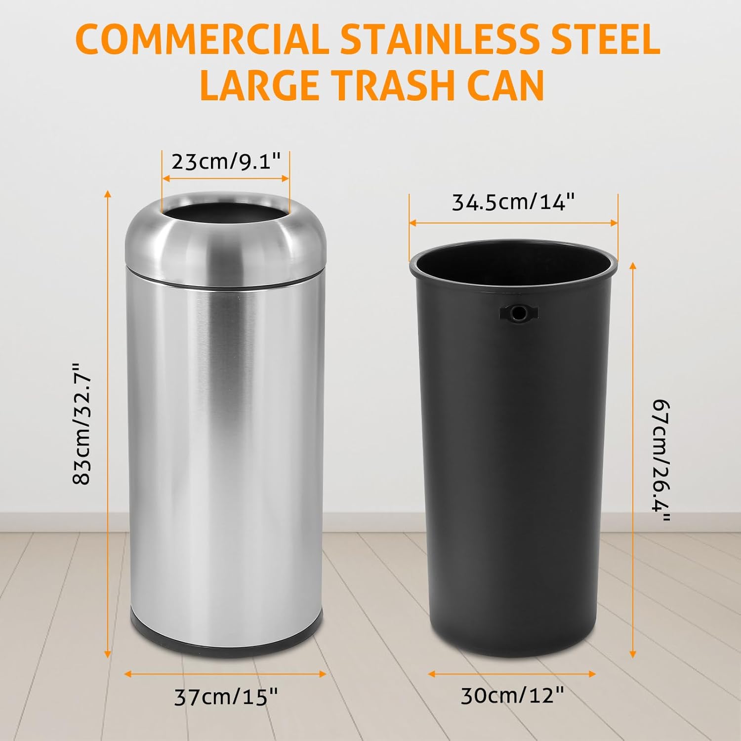 • Spacious 16-Gallon Capacity: This extra-large stainless steel trash can (32.67" tall, 14.56" diameter) offers ample space for high-traffic areas like hotels, restaurants, supermarkets, and homes. Its open-top design ensures easy waste disposal, reducing overflow and frequent emptying