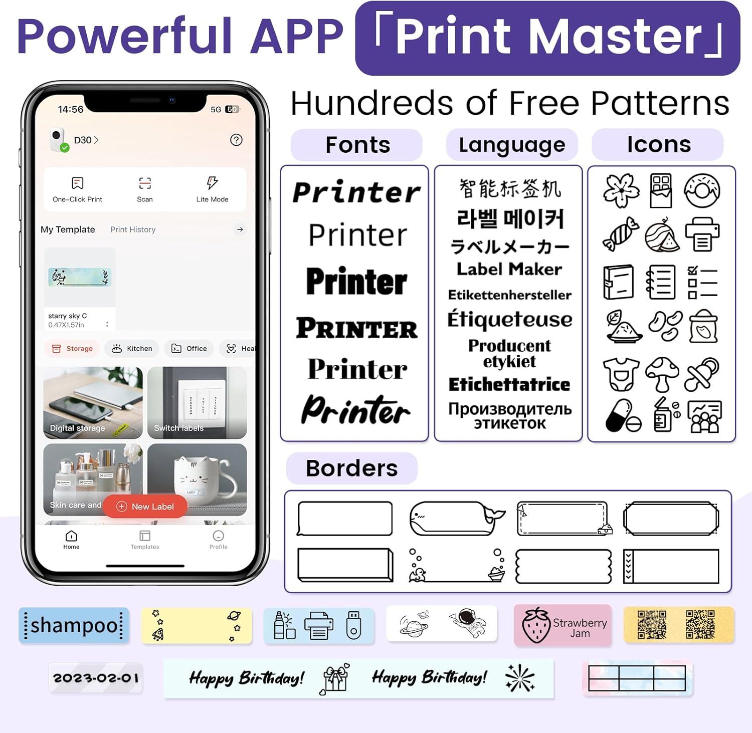 • 2025 Upgrade Version - The Phomemo D30 Bluetooth label maker supports continuous and fixed-length label tapes. It is half the weight and size of traditional label makers and is equipped with a German thermal print head. Print quality has increased by 25%, providing superior clarity, hassle-free operation, smooth printing, and fast processing