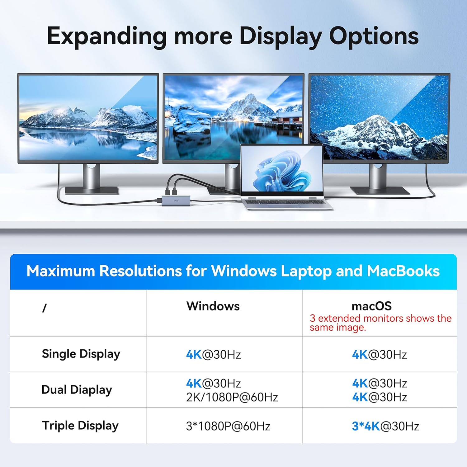 • 4K@60Hz High-definition Image: The usb c docking station dual monitor can easily to achieve dual monitor and triple displays for Windows(Note:MacBook laptops not support dual /triple displays). Single use HDMI 1/DP,resolution up to 4K@60Hz, single use HDMI2,resolution up to 4K@30Hz. USB C adpter connecting with 2 hdmi ports or hdmi1/2+display ports,dual monitors will be 4K@30Hz and 1080P@60Hz(DP1.4). usb c docking station connecting with dual hdmi+Display ports,triple monitors will be 1080P