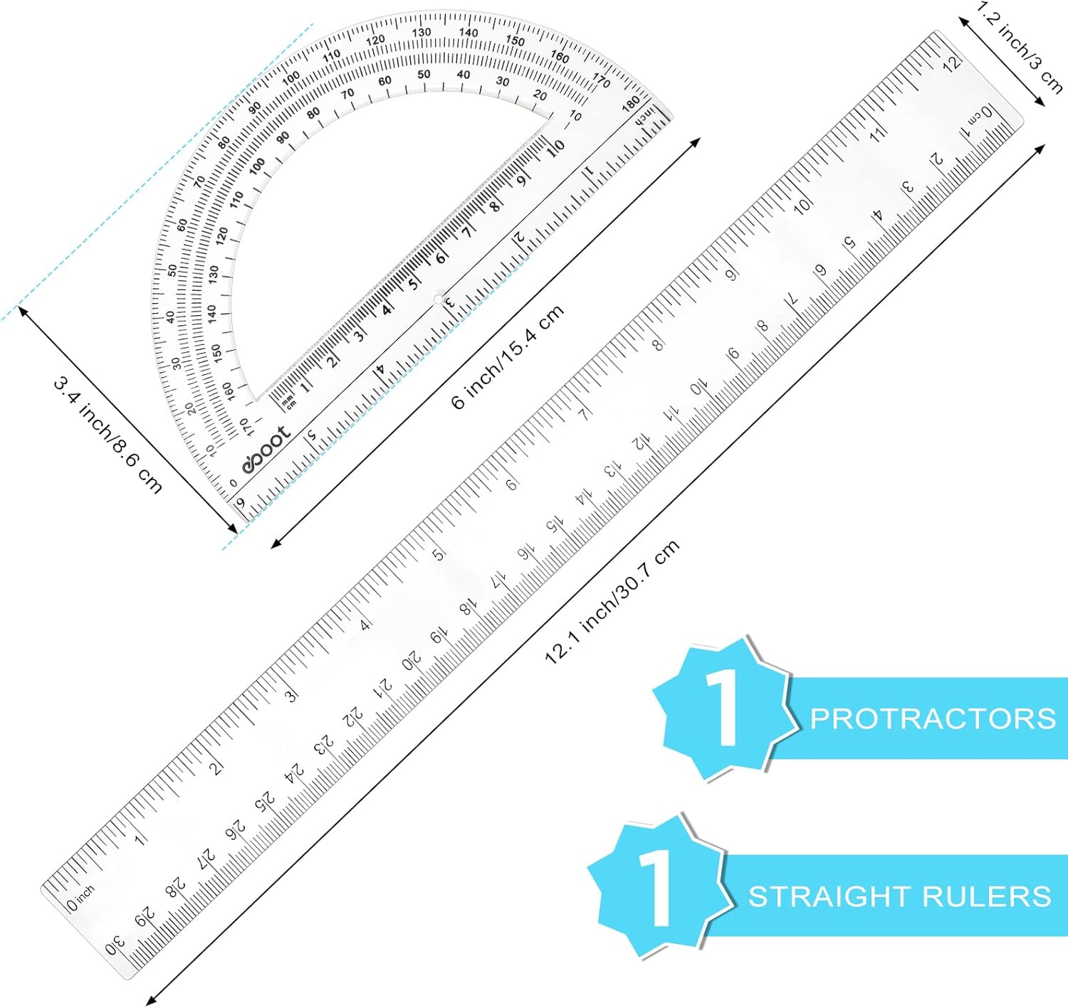 Zonon 2 Pack 12'' Plastic Ruler and 6'' Plastic Protractor Set Clear Ruler Protractor Set Math Geometry Supplies for School Classroom Home Office Drawing(Clear)
