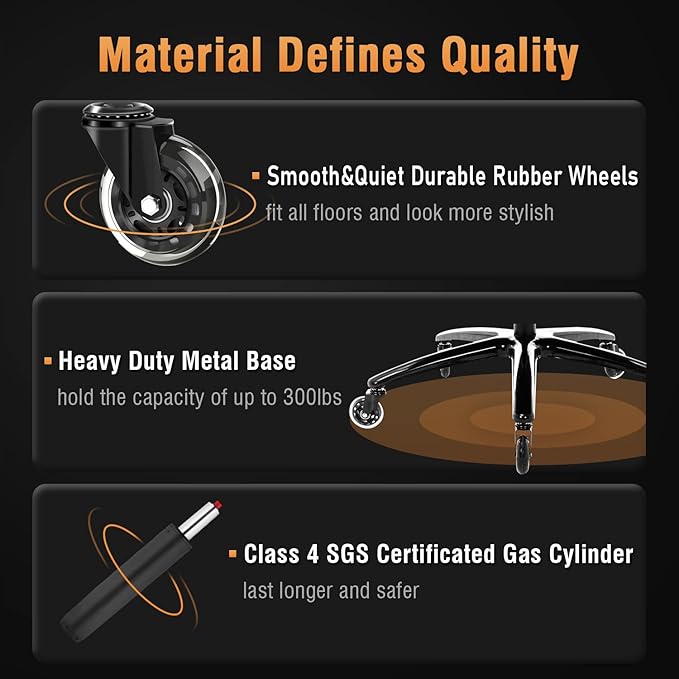 • 【Durable Chair For Most People】With a durable metal base, a heavy-duty gas cylinder, and smooth-rolling racing-style wheels, our work chair is made to last. It is extra-sturdy and stable and makes a long-lasting office accessory. The 300-pound weight capacity accommodates people with big or large body types, and the wide seat makes getting in and out easy