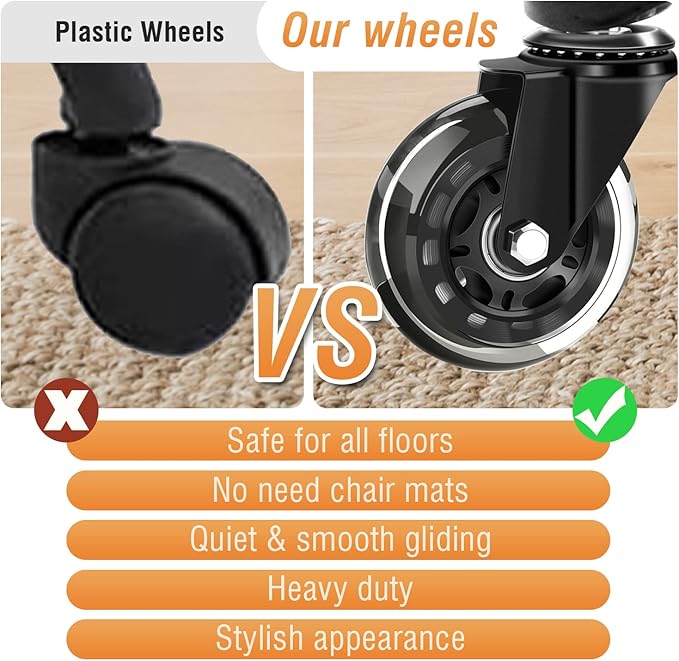 • 【Protect Your Floors From Scratches And Damage】Are you tired of swivel chairs that scratch your hardwood floors? Unlike many standard desk chairs, our swivel desk chair features top standard rubber chair wheels that ensure quiet and easy gliding. They are safe for all types of floors and take the fuss out of using a mat under your high computer chair