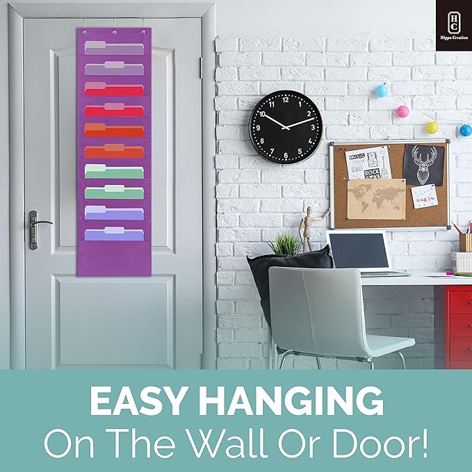 Hippo Creation Heavy Duty Storage Pocket Chart for Classroom, 10 Pocket Storage Organizer with 3 Over-Door Hangers, Hanging Wall Organizer for File Folders, School Mailbox, Home Office Papers - Purple