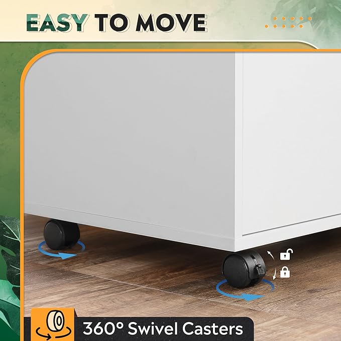 • Easy Mobility: The wooden file cabinet is equipped with 5 rolling wheels, allowing it to be easily moved and positioned beside or under desk. The front 2 wheels have built-in brakes and the bottom center is equipped with anti-tip casters to keep the cabinet stable.