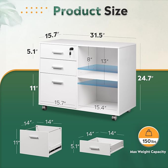 • Multifunctional File Cabinet with Lock: This file cabinet features open storage spaces, file drawers, and storage cabinets, allowing you to organize office equipment, papers, files, and supplies neatly. It keeps your personal belongings secure.