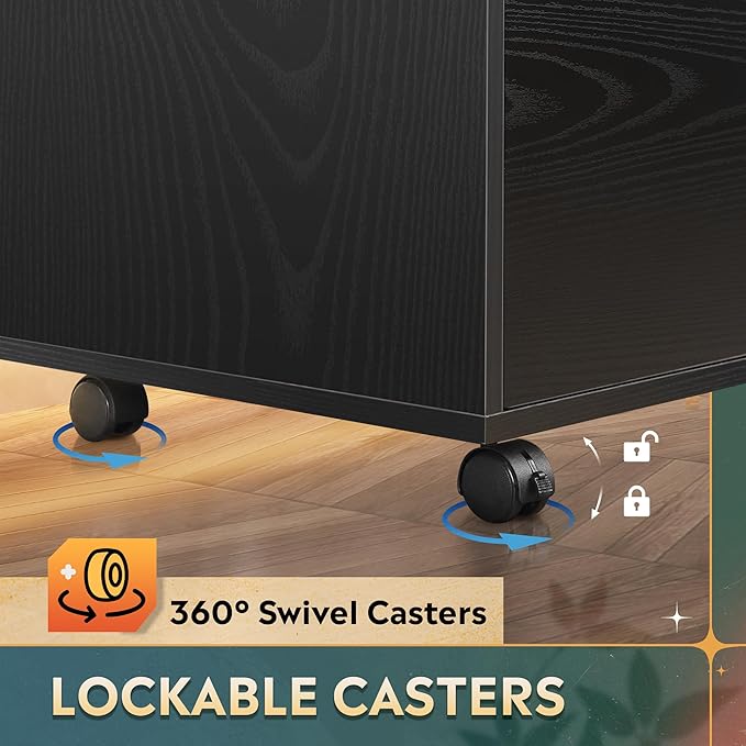 • Easy Mobility: The wooden file cabinet is equipped with four rolling wheels, allowing it to be easily moved and positioned beside or under a desk. The front two wheels have built-in brakes to keep the cabinet stable.