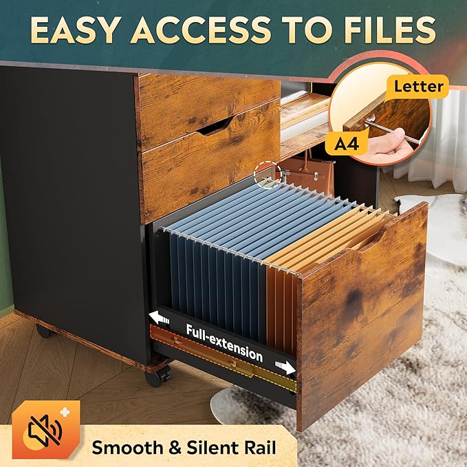 • 3 DRAWERS & LARGE OPEN STORAGE: 2 top small drawers provide plenty of storage space for small items. Bottom drawer keeps hanging letter, A4 size files organized and extends fully for easy access.