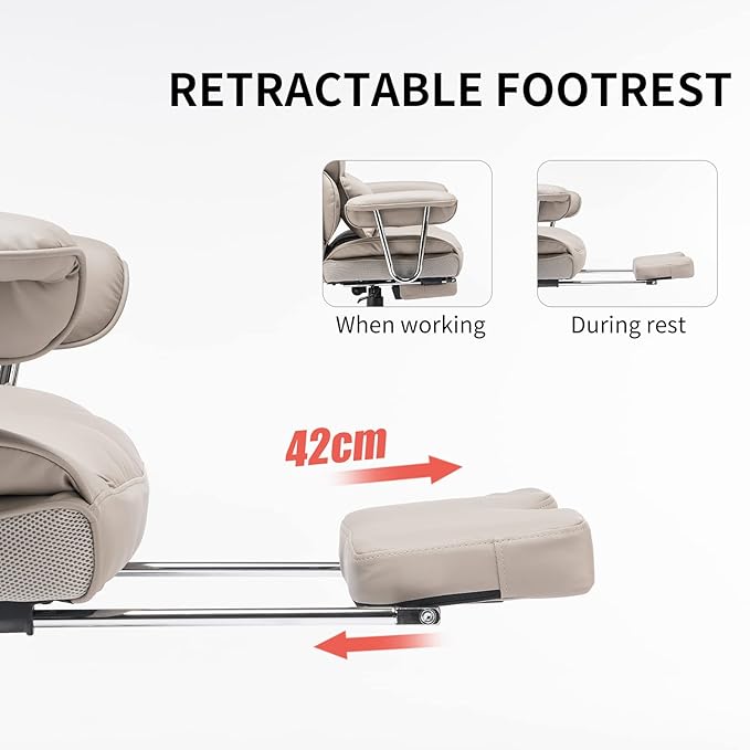 • ERGONOMIC RECLINING OFFICE CHAIR — This executive office chair features a 360° swivel, adjustable height, and a reclining backrest that tilts up to 135° for customized comfort. BUILT-IN FOOTREST & TILT TENSION CONTROL — Includes a retractable footrest and a tilt tension knob, allowing you to control the rocking pressure and find the perfect recline angle for working or relaxing. Ideal for your home office setup.
