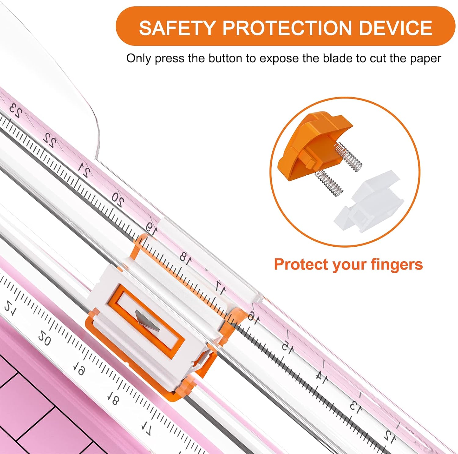 • SHARP YET SAFE: The blade of this paper cutter slider is incredibly sharp; It can cut several sheets of paper (80g/m2) at once; But it's also covered in a way that is much safer than a typical guillotine paper slicer; So you can't cut yourself; It's very user-friendly, even for children (Tips: 1. Please press down a little harder on the cutting blade as you slide for a clean cut; 2. Cutting a little less at a time can help prolong the blade's service life.)