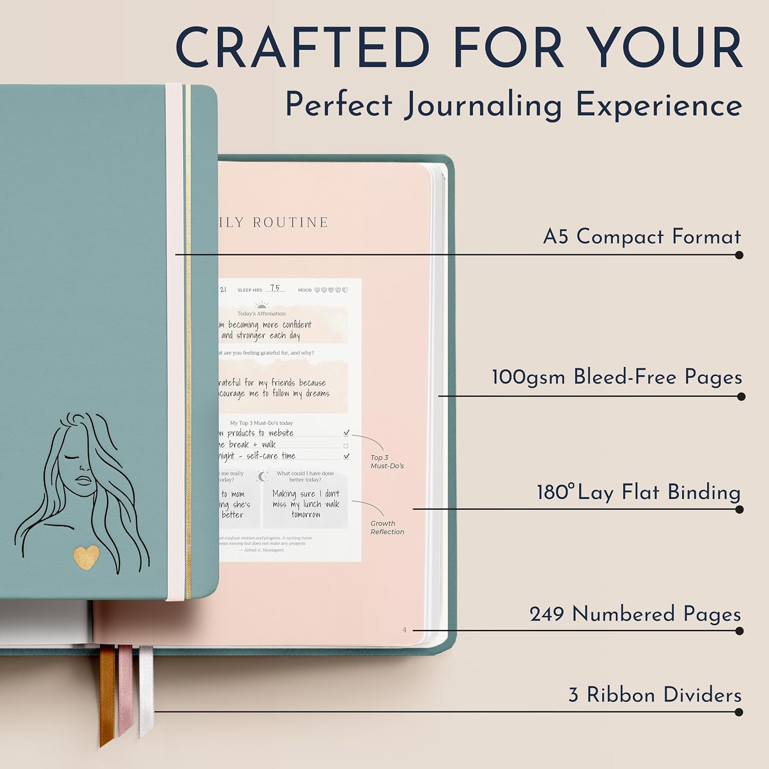 • Premium Journaling Experience - Relish the luxury of an A5 fabric hardcover, the quality of 100gsm bleed-free pages, and a 180 degree lay-flat design. Three elegant cover shades, all presented in a beautifully crafted gift box, showcase the perfect blend of function and artistry.