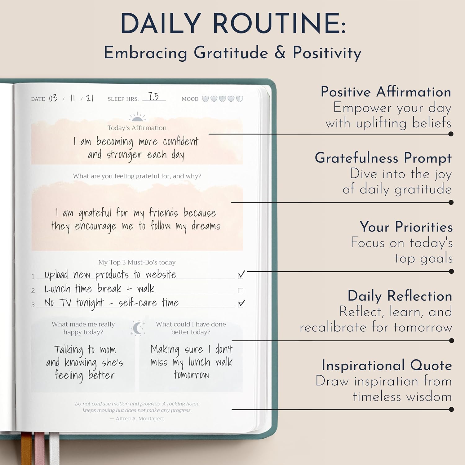 • Daily Dose of Positivity - Boost your day with uplifting positive affirmations and bask in the joy of daily gratitude prompts. Stay centered with a focus on today's paramount goals. Engage in meaningful daily reflection to recalibrate for tomorrow, and draw motivation from handpicked inspirational quotes, channeling timeless wisdom.