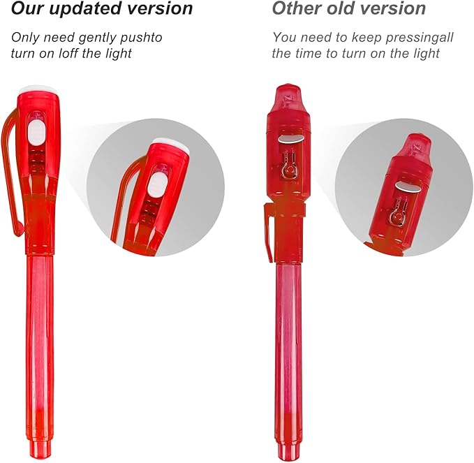 • Upgrade design: the original press type switch was upgraded to the push type switch, which can easily push and light up continuously; our upgrade invisible ink pen can emit more powerful and beautiful beams.