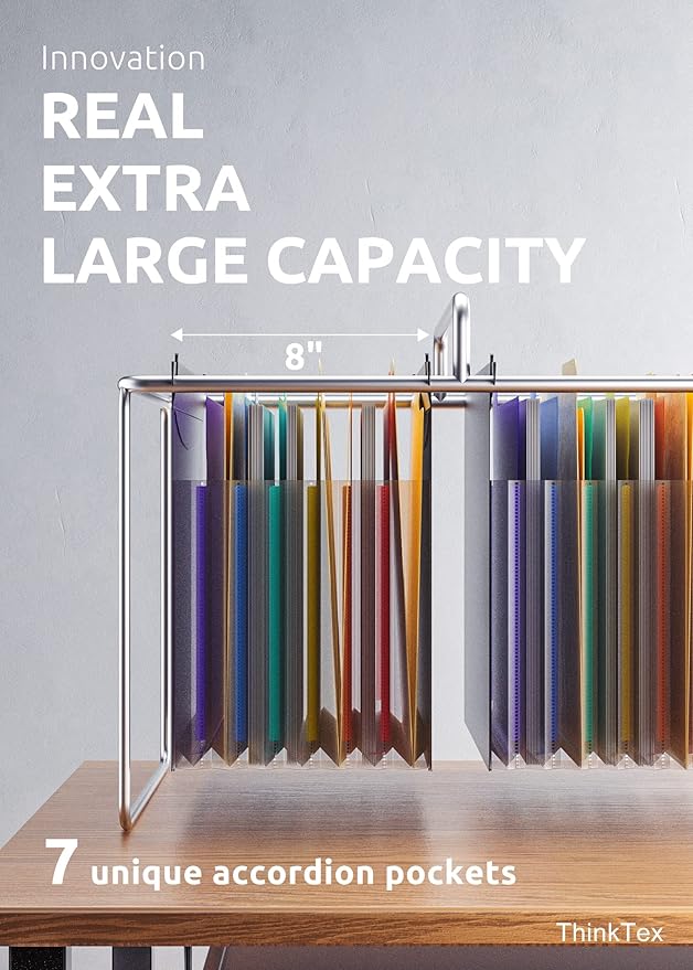 ThinkTex Plastic Expanding Hanging File Folders, 7 Innovative 1.2" Accordion Pockets, Large Capacity, Multi-Color Tabs, Letter Size for Filing Cabinet - 1 Pack