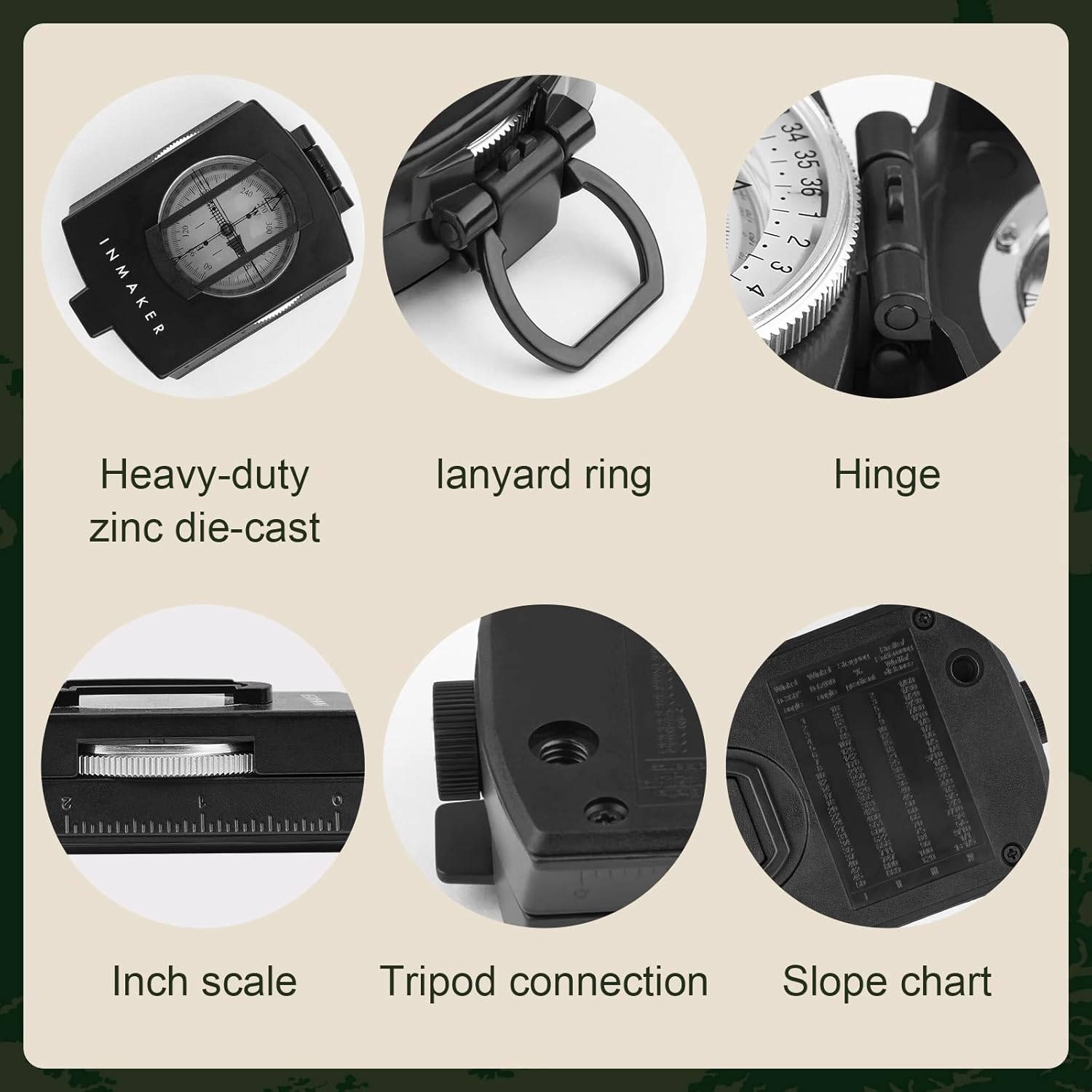 • Small Size, Wide Functions - The INMAKER compass possess a sighting line, magnifier viewer, tripod attachment, reading eyepiece, slope ratio chart and adjustable prism. Definitely portable , compact enough to be fastened on your belt or rucksack without compromising your actions.